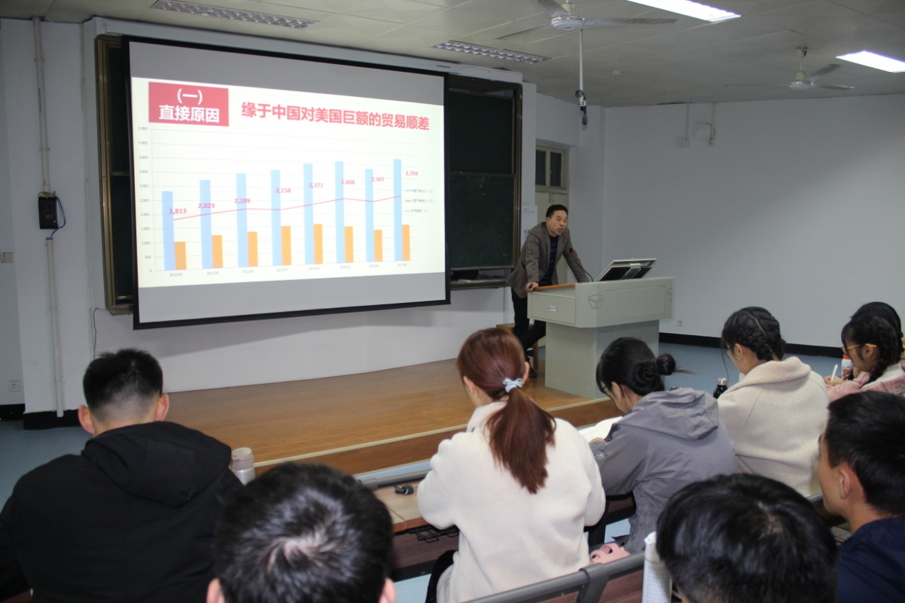 11月21日晚上,我院2019年研究生学术活动月“读原著学原文悟原理”系列校内讲座第三场在人文楼408教室举行,由王帆宇博士做《新时代中国外交面临的机遇、挑战与对策——以中美贸易摩擦为例》专题讲座。学院全体研究生参加了讲座。