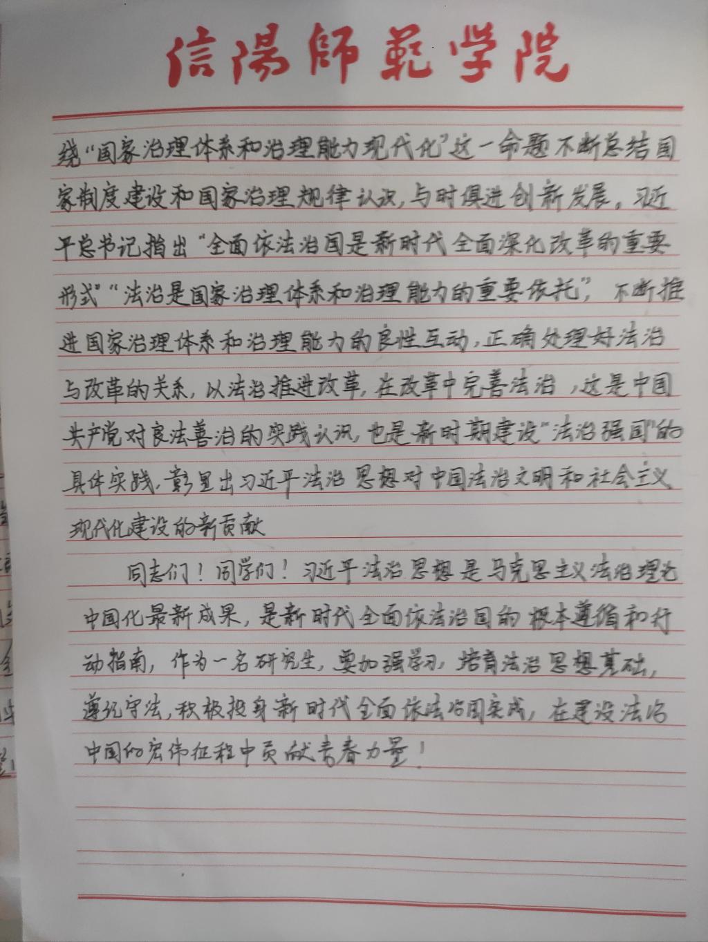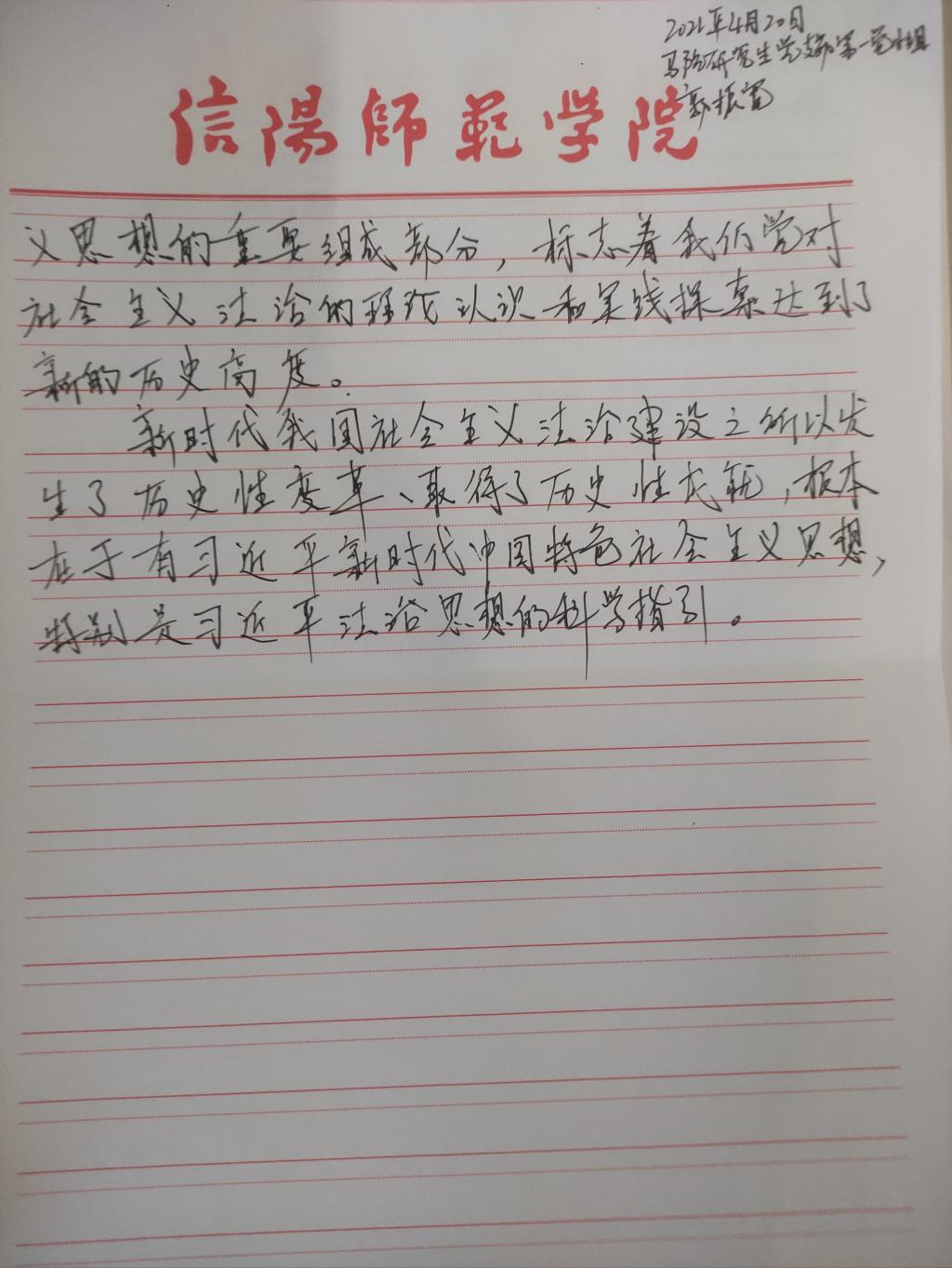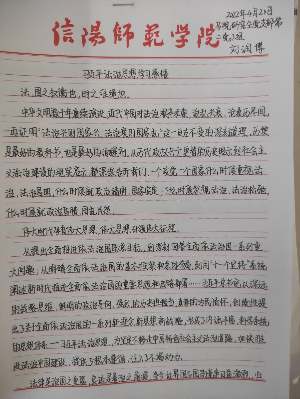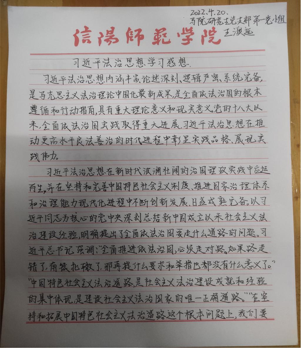 为深入学习贯彻习近平法治思想,增强我院研究生党员的政治素养和法治意识,我院研究生党支部开展了习近平法治思想学习交流主题党日活动。我院研究生党员、预备党员及发展对象积极参与,充分运用互联网等多渠道展开学习,通过观看相关法治宣传片、系统学习习近平法治思想,进一步增强法治意识和思想觉悟。大家根据学习情况,结合自身实际,认真撰写学习习近平法治思想的心得感悟,以下为部分同志撰写的心得感悟图片。