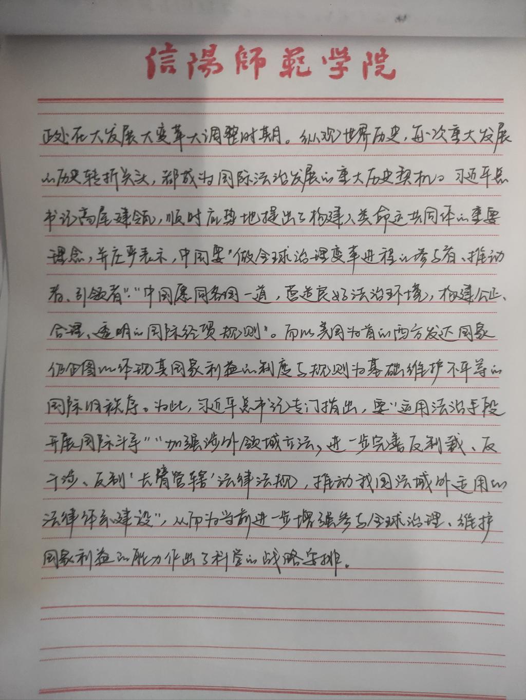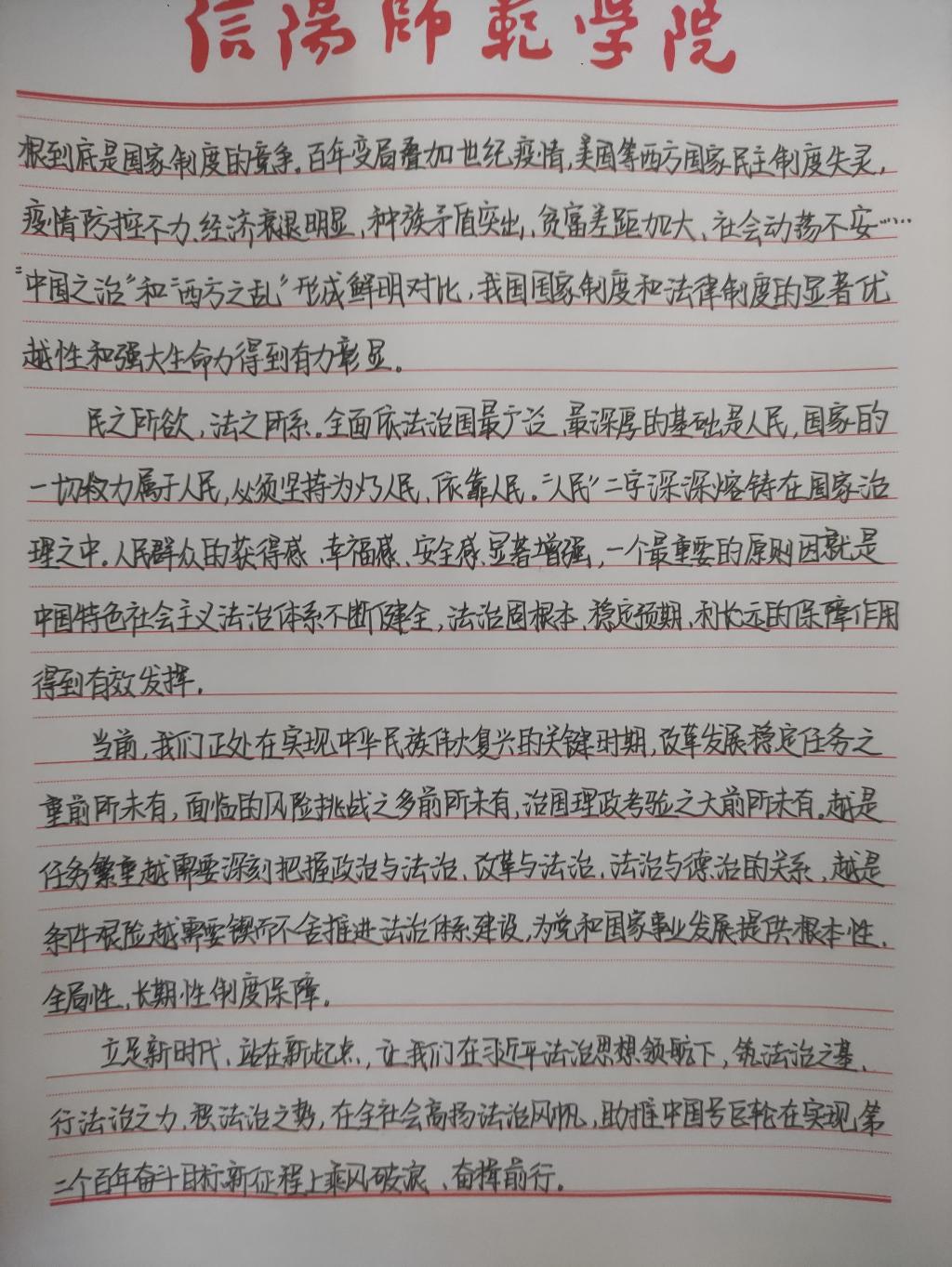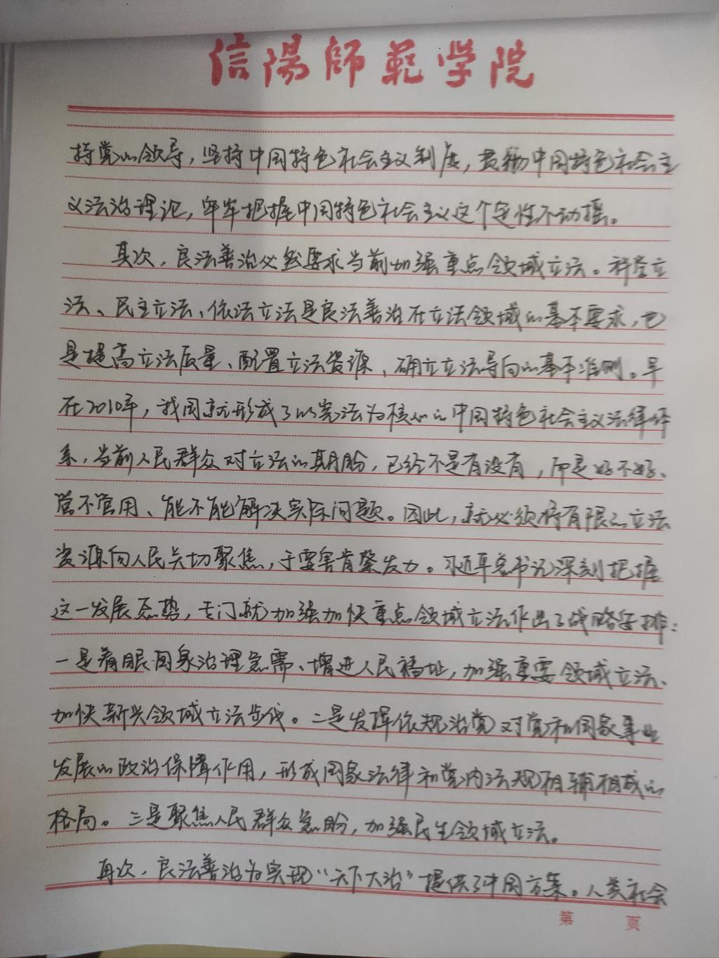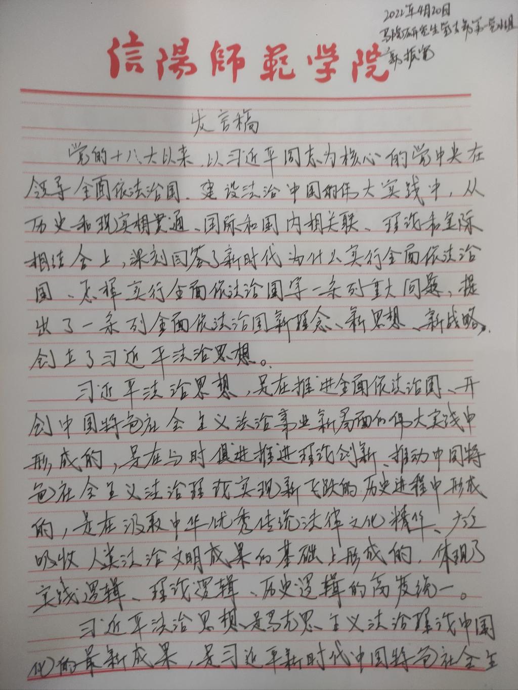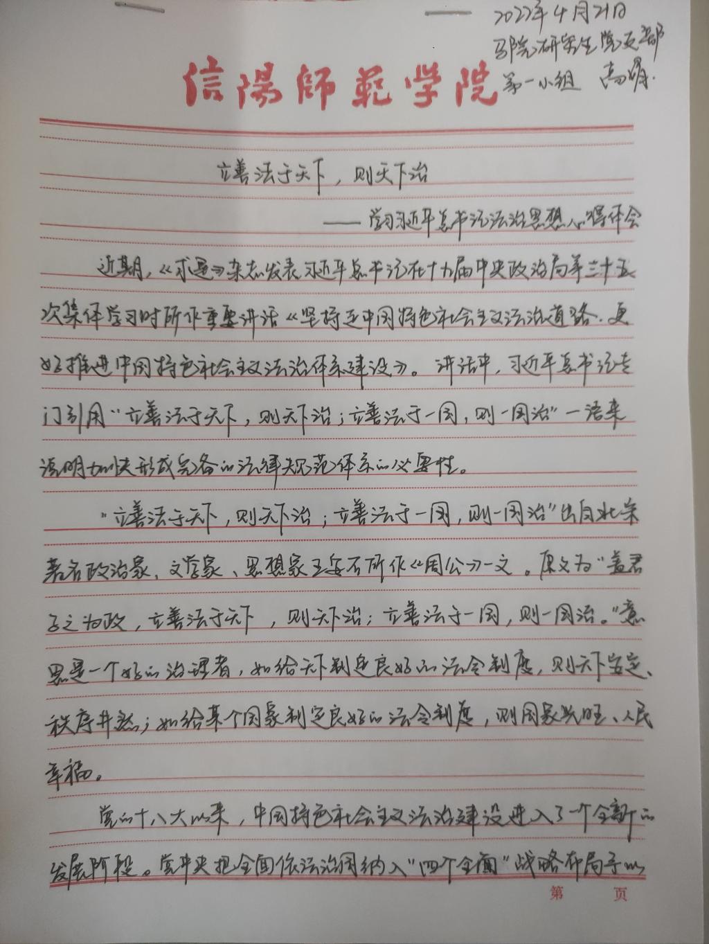 为深入学习贯彻习近平法治思想,增强我院研究生党员的政治素养和法治意识,我院研究生党支部开展了习近平法治思想学习交流主题党日活动。我院研究生党员、预备党员及发展对象积极参与,充分运用互联网等多渠道展开学习,通过观看相关法治宣传片、系统学习习近平法治思想,进一步增强法治意识和思想觉悟。大家根据学习情况,结合自身实际,认真撰写学习习近平法治思想的心得感悟,以下为部分同志撰写的心得感悟图片。