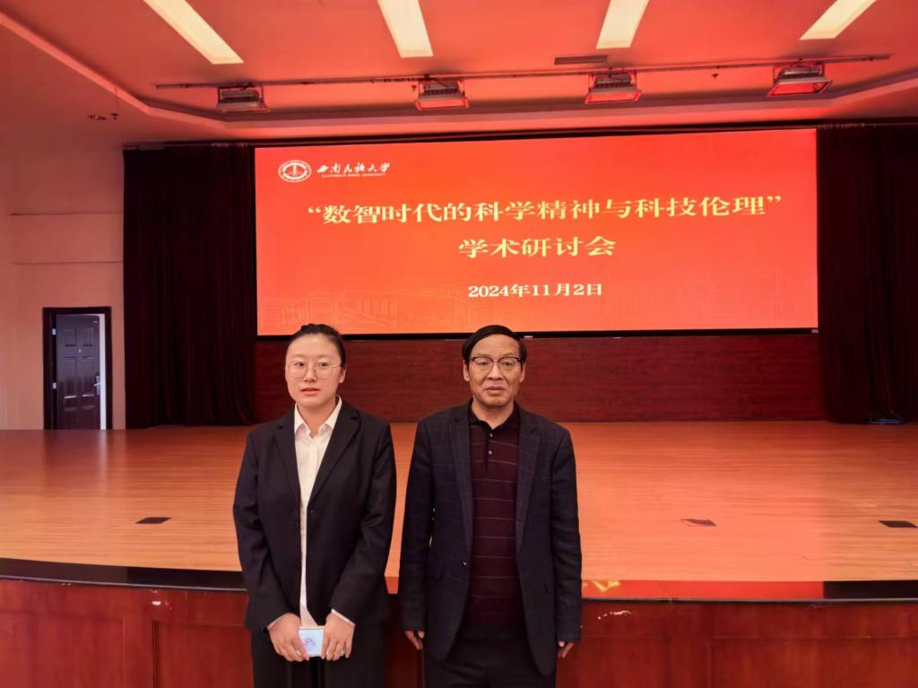 2024年11月1日-3日,“数智时代的科学精神与科技伦理”学术研讨会在西南民族大学举行。受中国自然辩证法研究会科学精神与科技伦理工作委员会以及西南民族大学太阳集团tyc5997的邀请,太阳集团tyc5997教授、河南省科学家精神宣讲团成员张铁山及其研究生赵玮嘉同学共同参加了本次学术会议。张铁山教授以“中国科学家精神谱系及其新时代科学家精神培育”为题,从科学精神、科学家精神、中国科学家精神谱系、西方科学家精神的思想源流、中国科学家精神谱系的生成和内容以及新时代科学家精神培育路径等方面作了一场精彩的具有哲理性和科学性的学术报告,得到了与会专家和学者们的好评和赞誉;研究生赵玮嘉同学以“新时代科学家精神融入初中思政课的路径探究”为题,从新时代科学家精神生成的理论和时代背景、新时代科学家精神的本质内蕴以及新时代科学家精神融入初中思政课的有效路径三个方面对新时代科学家精神的传播方法给予了分析,得到了与会专家和学者们的认可和好评。