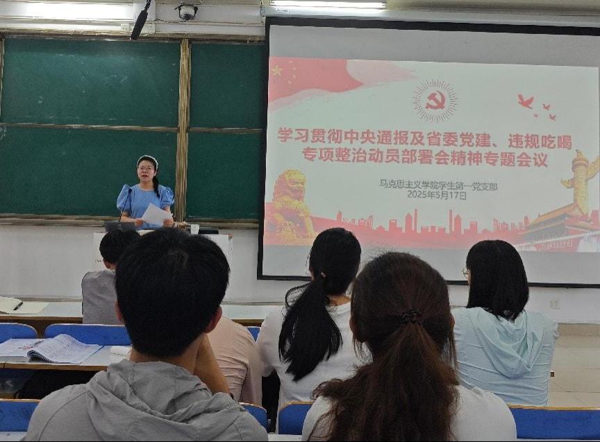 会上,党支部书记高小佳首先传达了中央层面深入贯彻中央八项规定精神学习教育工作专班、中央纪委办公厅对李献林、叶金广等人违规吃喝严重违反中央八项规定精神问题的公开通报内容,强调了违规吃喝问题对党风党纪的严重危害,警示学生党员们要时刻保持警醒,严守纪律红线。