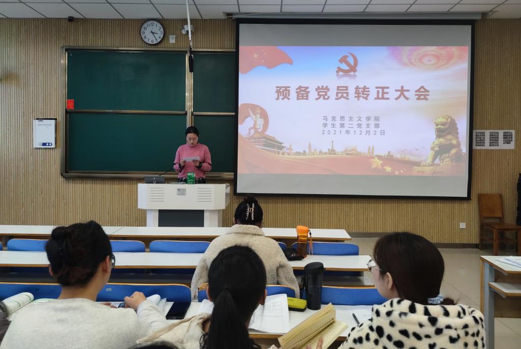 12月2日下午,太阳集团tyc5997学生第二党支部在社科楼515教室召开2021年下半年接收预备党员转正支部大会,我院学生第二党支部正式党员曹梦真、杨康、王文慧、张甜甜、黄子晋,学生第二党支部预备党员和党员发展对象共同参加本次会议。会议由杨康主持。