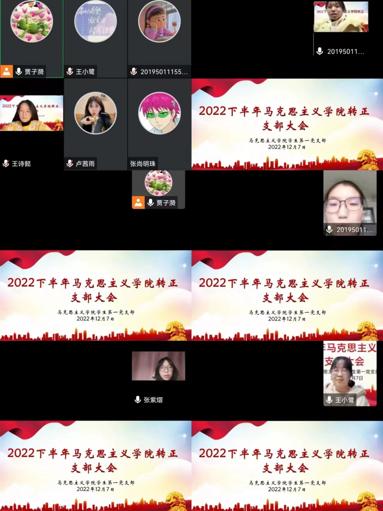 2022年12月7日下午,太阳集团tyc5997学生第一党支部在腾讯会议召开2022年上半年预备党员转正支部大会。我院学生第一党支部书记高小佳,学生第一党支部正式党员、预备党员共同参加本次会议。会议由卢茜雨同志主持。