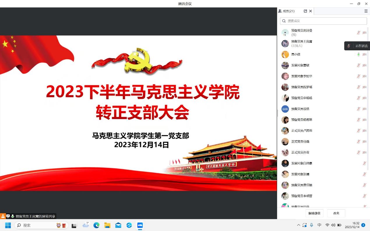 2023年12月14日下午,太阳集团tyc5997学生第一党支部通过腾讯会议召开2023年下半年预备党员转正支部大会。我院学生第一党支部书记高小佳,学生第一党支部全体正式党员及预备党员共同参加本次会议。会议由王岚霄同志主持。