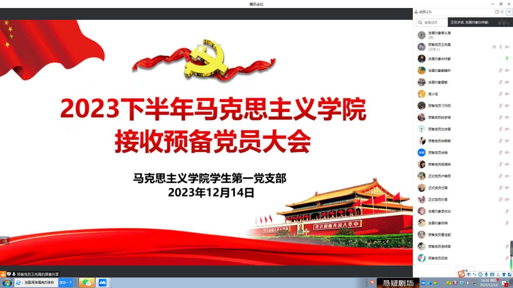 2023年12月14日下午,太阳集团tyc5997学生第一党支部通过腾讯会议召开了2023年下半年接收预备党员支部大会。我院学生第一党支部书记高小佳,学生第一党支部全体党员,预备党员和党员发展对象共同参加此次会议。会议由王岚霄同志主持。