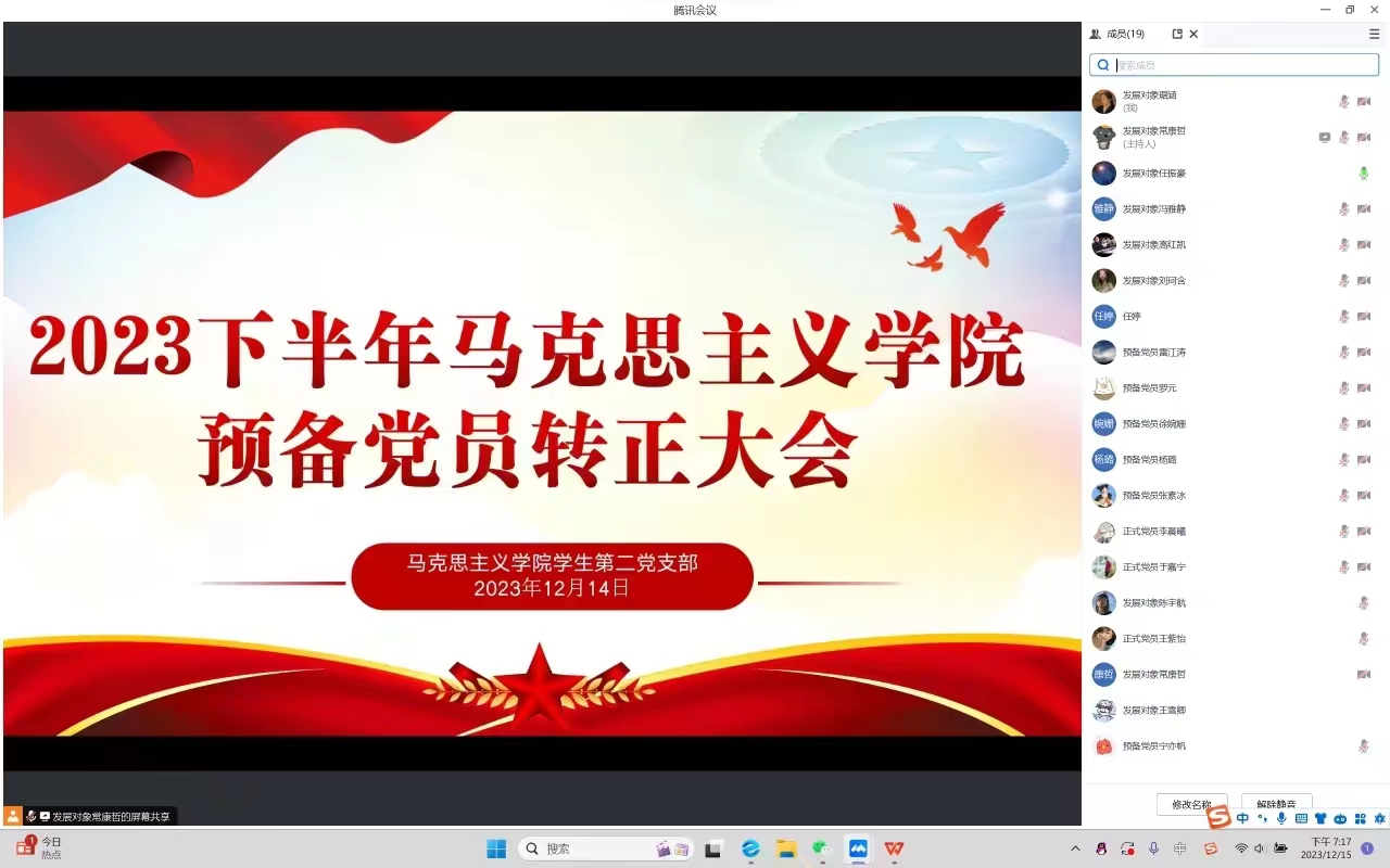 2023年12月14日下午,太阳集团tyc5997学生第二党支部在腾讯会议召开2023年下半年预备党员转正支部大会,我院学生第二党支部全体正式党员及预备党员共同参加本次会议。会议由任振豪同志主持。