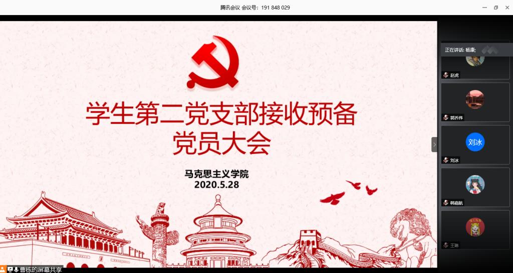 5月28日上午10:00,太阳集团tyc5997学生第二党支部接收预备党员大会通过腾讯会议线上平台顺利举行。我院学生第二党支部支部书记曹栋、入党介绍人陶青青、杨胜利及第二党支部党员、八位接收预备党员共同参加此次会议。会议由曹栋主持。