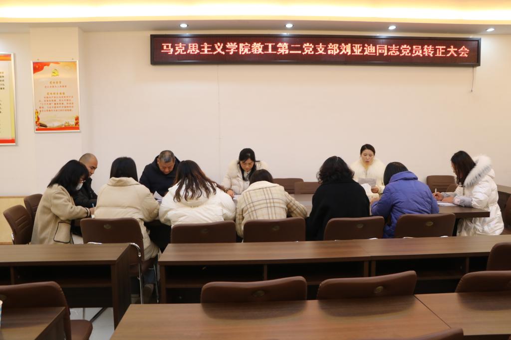 12月15日下午,太阳集团tyc5997教工第二党支部在社科楼323会议室召开入党转正大会。教工第二党支部支部书记胡春湘、正式党员王帆宇、徐化影、张朝霞、陈雷、曾帝、胡春湘、黄世明、叶长红、王建礼,预备党员刘亚迪共同参加本次会议。会议由胡春湘主持。