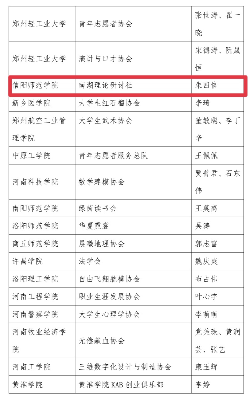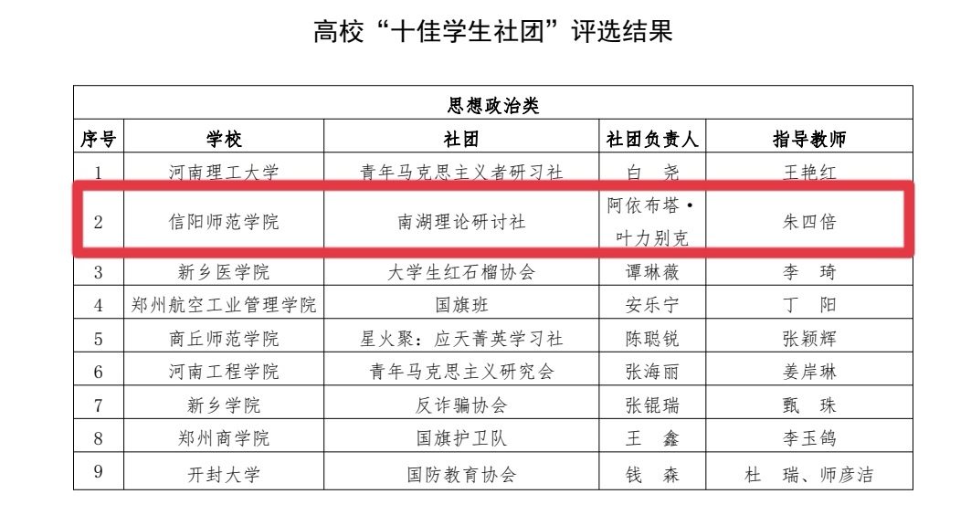 经我院内部选拔、学校推荐、专家评审等环节,在2021年度“两争两创”活动先进集体和先进个人推选工作活动和2021年全省高校学生社团品牌建设系列活动中,我院南湖理论研讨社表现优异,荣获“河南省文明社团”、省高校“十佳学生社团”称号。