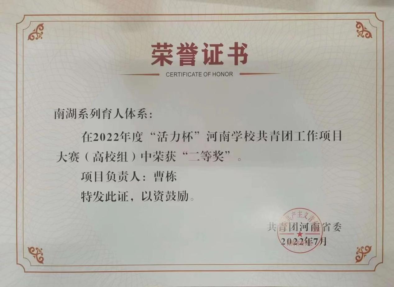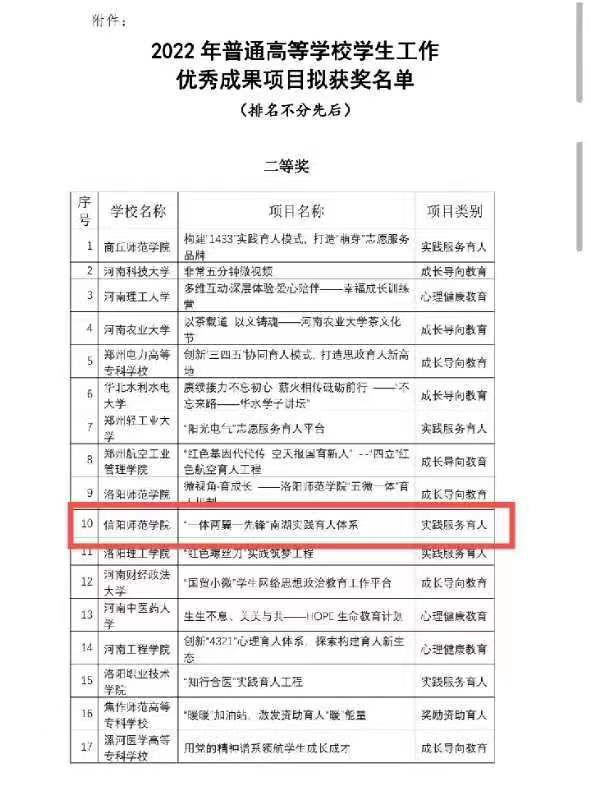 为深入学习贯彻党的二十大精神,河南省教育厅办公室组织开展了2022年普通高等学校学生工作优秀成果项目评选活动。太阳集团tyc5997“一体两翼一先锋”实践育人体系以脚踏实地的态度、先进的理论指导、丰富多彩的育人活动获得2022年普通高等学校学生工作优秀成果项目拟获奖二等奖。