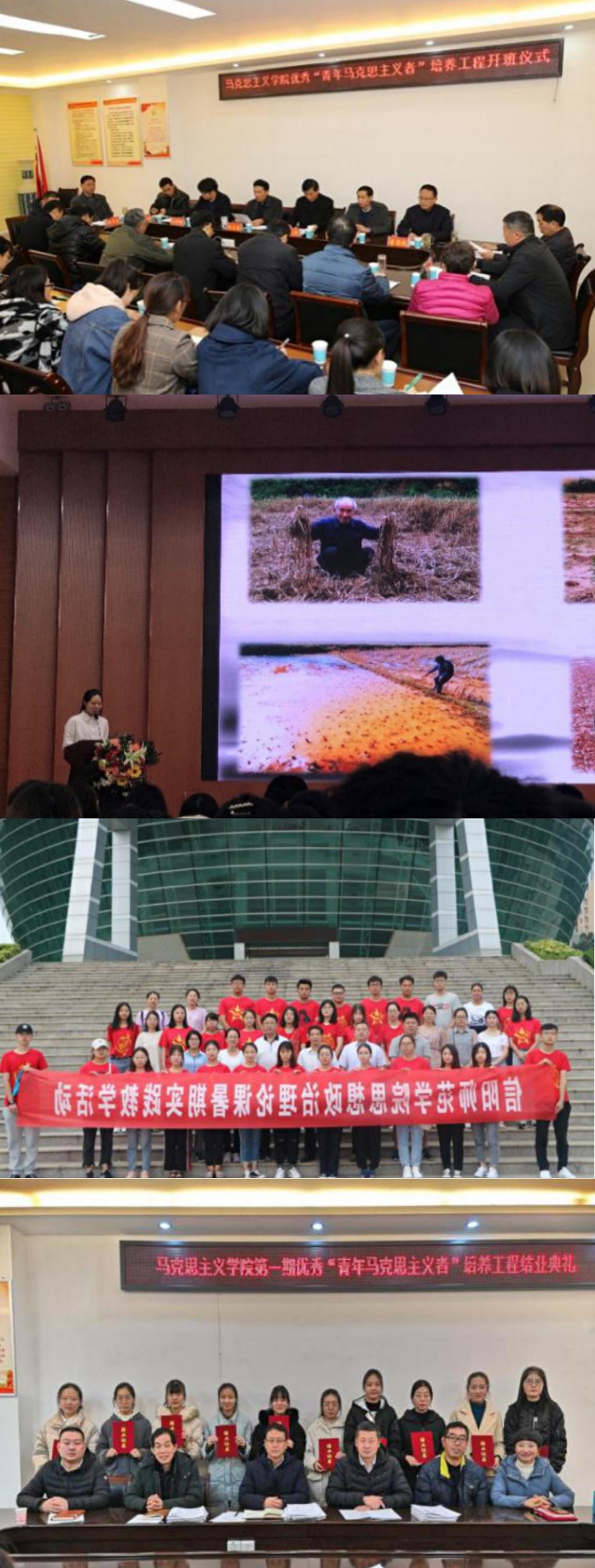为加强在校期间大学生马克思主义理论学习,进一步坚定大学生马克思主义信仰,培养争做担当民族复兴大任的时代新人,我院于2018年开办优秀"青年马克思主义者”培养工程,目前开设一期,并已圆满结束。该工程将理论学习、宣讲活动、社会实践三者统一来提高学员自身的理论水平、实践水平、学习水平,努力贯彻习近平新时代中国特色社会主义思想,旨在提高大学生的思想政治素质、理论水平和实践能力,引导大学生积极争做优秀“青年马克思主义者”。