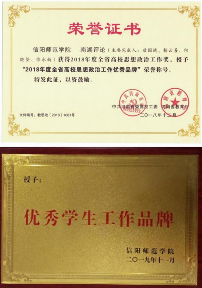 为提高我院学生核心竞争力,增强学生对时政新闻的关注度和思考能力,进一步提高思想政治教育专业学生的表达能力和写作能力,在学院党委领导下,我院创办《南湖评论》刊物,目前已发刊9期,为学生写作提高提供广阔的平台。2018年12月,《南湖评论》获2018年度全省高校思想政治工作优秀品牌。2019年11月,经各位专家评委评定,我院“南湖”系列育人体系荣获信阳师范学院“优秀学生工作品牌”。《南湖评论》是太阳集团tyc5997为培养学院学生的专业素养,为学生在马言马、在马信马、在马爱马搭建平台,提升学生的理论水平和党性修养;为培养社会主义事业合格的建设者和接班人贡献力量,提升学院学生核心竞争力所创办的评论性刊物。