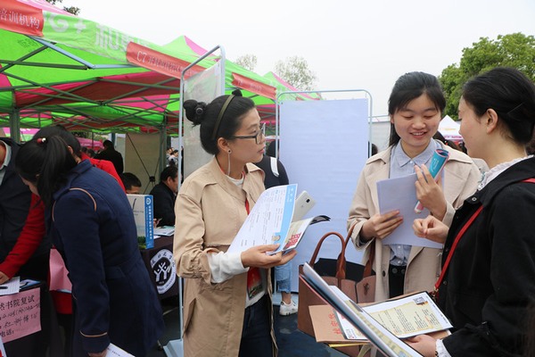 4月14日上午,河南省毕业生就业市场豫南地区分市场暨信阳师范学院2018届毕业生春季双选会在我校人文楼西篮球场举行,本次双选会由河南省教育厅主办,信阳师范学院、信阳市人力资源与社会保障局共同承办。我院院长杨云善、团委老师孙绪曙、曹菁菁到场了解企业用人情况、招聘情况。来自制药、教育、金融、文化、建筑、销售、信息技术等行业领域的二百余家企事业单位参加了招聘会,吸引了我院多名毕业生前来应聘。