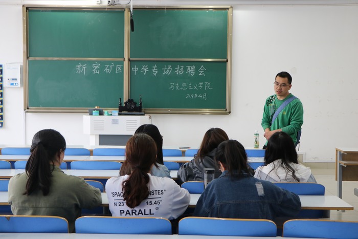 招聘会上,赵丽君首先为大家讲述了新密市矿区中学的基本情况,详细介绍了学校的发展历程、教学环境、教育理念、薪资待遇、招聘要求等内容。接着,他将公办学校与民办学校做了对比,突出了公办学校在准入条件、薪资待遇、发展空间等方面的优势。同时,他希望,大家结合自身实际情况认真考虑就业问题,实现就业目标。最后,赵丽君结合自身经历分享就业经验,并与大家进行面对面交流,对学生们提出的问题进行详细解答。在场应届毕业生主动表达个人求职意向,投递个人简历,表示将为前往用人单位试讲做积极准备。