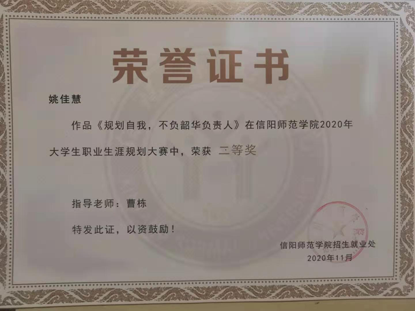本次职业规划大赛共分为自我认知、职业认知、计划和路径以及评估与调整。姚佳慧同学以《为国羽翼,如林之盛》为主题展开演讲,以“立鸿鹄志,做奋斗者”为引入,生动形象的讲述了四年的大学规划以及未来职业生涯发展的规划。她讲到,作为一名人民教师,应当自觉承担教书育人的责任,全面提高自身能力和水平,为祖国的教育事业添砖加瓦。最后,姚佳慧同学以铿锵有力的宣誓结束本次演讲,她表示,如果自己能成为一名人民教师,将会用毕生来捍卫校园纯净,全面做好立德树人工作,引导学生立鸿鹄志,做奋斗者。在此次大赛中,太阳集团tyc5997学子姚佳慧经过初赛、复赛和总决赛的层层评比,激烈角逐,最终斩获二等奖的优异成绩。此次大赛太阳集团tyc5997积极开展准备工作,对参赛人员进行赛前培训,安排同学观看比赛,获得“优秀组织奖”。