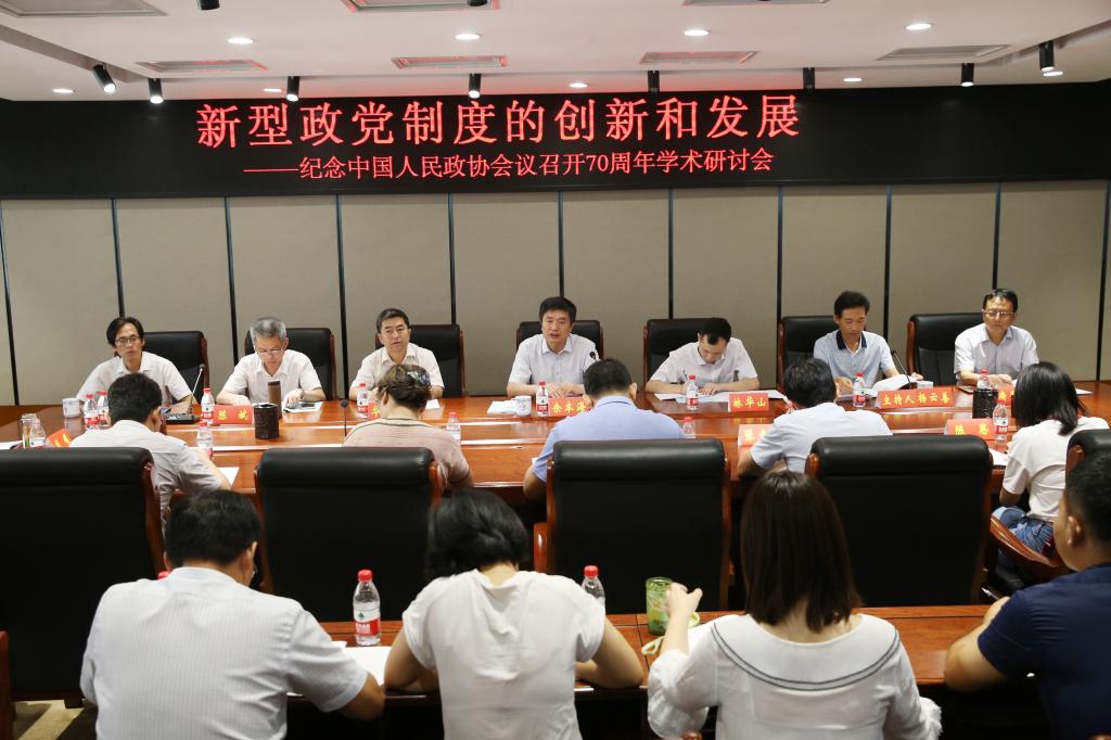 为了更好地纪念中国人民政治协商会议召开70周年,凝聚和深化学界学习研讨习近平新时代统一战线思想的学术共识,8月17日,由中国统一战线理论研究会统战基础理论研究上海研究基地(复旦大学)、信阳师范学院主办,河南省统一战线理论研究信阳师范学院基地、信阳师范学院当代马克思主义研究所承办,《统一战线学研究》期刊社、大别山干部学院协办的“新型政党制度的创新与发展——纪念中国人民政协会议召开70周年”学术研讨会在我校逸夫楼321会议室召开。副校长余本海出席开幕式。来自浙江财经大学、中央社会主义学院、武汉大学、山东大学、黄淮学院、重庆教育科学研究院、信阳市政协、大别山干部学院及重庆社会主义学院《统一战线学研究》期刊社及我校太阳集团tyc5997师生代表60余人参加了会议。开幕式由太阳集团tyc5997院长杨云善教授主持。