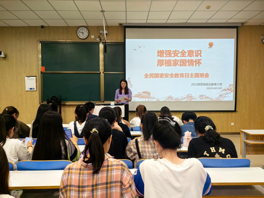 一、大处着眼,小处着手,开展相关主题班会活动。我院思想政治教育专业全部班集体相继召开主题班会,围绕“什么是国家安全”、“为什么重视国家安全”和“如何维护国家安全”三方面展开。采取辅导员讲解、PPT放映、播放视频和电影相结合的形式,帮助同学们了解国家安全,引导青年树牢总体国家安全观。