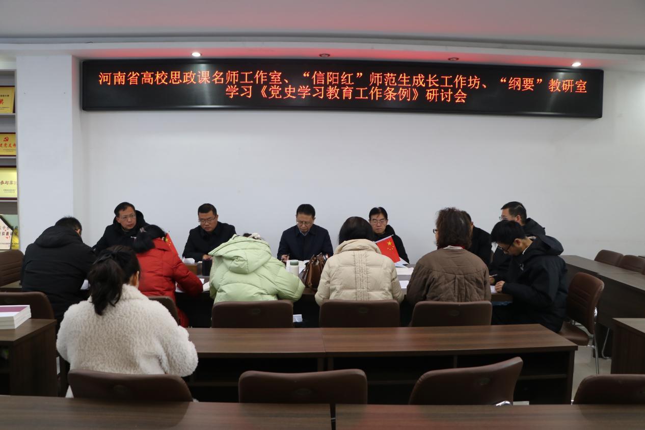 为深入学习贯彻《党史学习教育工作条例》重要精神和要求,2月28日上午,河南省高校思政课名师工作室(太阳集团tyc5997)、“信阳红”师范生成长工作坊、《中国近现代史纲要》教研室在社科楼323会议室召开学习《党史学习教育工作条例》座谈会。太阳集团tyc5997院长唐国战、校党委组织部副部长周贤亮、副院长周智,国际教育学院党委副书记付春峰以及《中国近现代史纲要》教研室专兼职教师共同参与研讨。会议由教研室主任陈杰主持。
