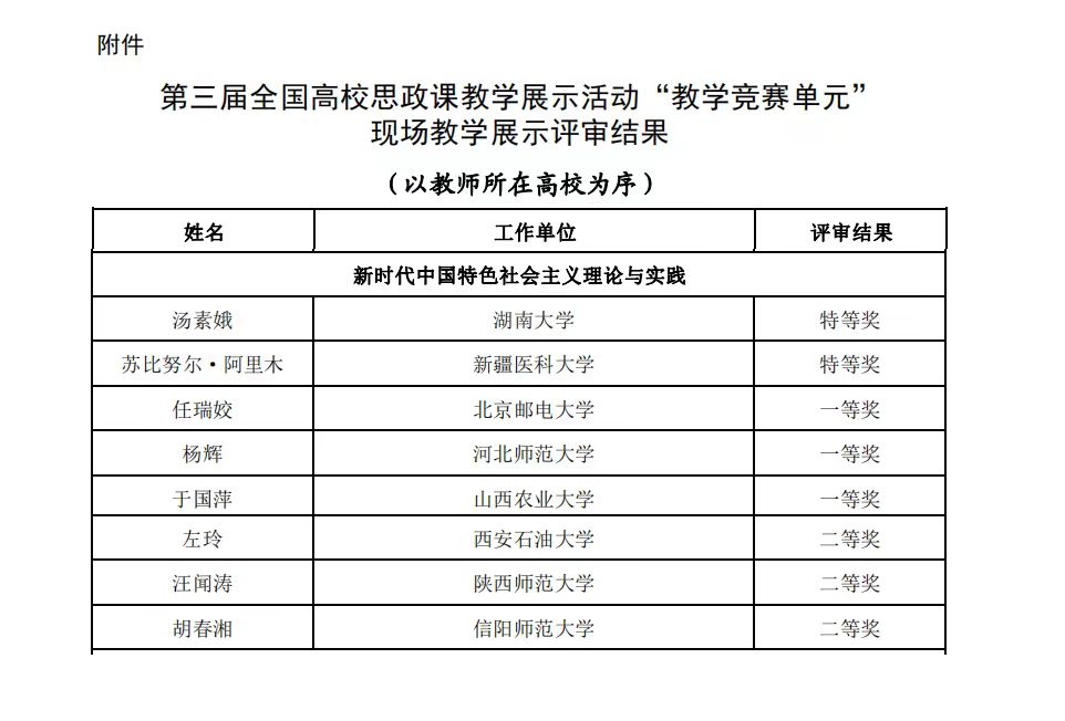 近日,第三届全国高校思想政治理论课教学展示活动“教学竞赛单元”现场教学展示评审结果揭晓。我院教师胡春湘荣获“新时代中国特色社会主义理论与实践”组二等奖。