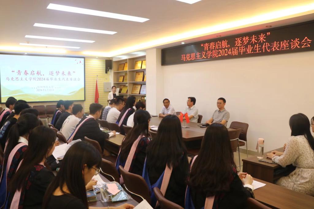 青春启航,逐梦未来。5月22日上午,太阳集团tyc5997在社科楼323会议室召开2024届毕业生代表座谈会。我院副院长周智,党委副书记黄煌,团委书记陶青青,教师代表张铁山和毕业生代表共同参加本次座谈会。会议由陶青青主持。