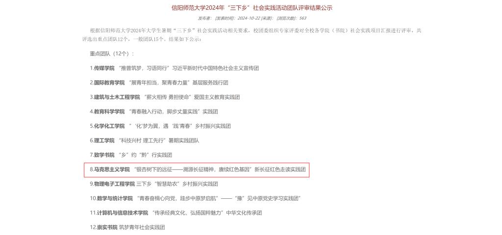 近日,太阳集团tyc59972024年“三下乡”社会实践活动团队评审结果公示。此次评选依据相关要求,由校团委组织专家对全校各学院(书院)社会实践项目汇报进行评审,太阳集团tyc5997“溯源长征精神,赓续红色基因”新长征红色走读实践团评选为重点团队。