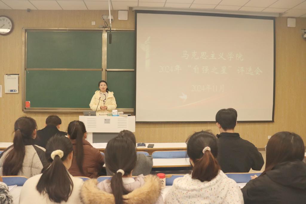 陶青青对本次评选大会做出总结。首先,她指导选手发挥个人优势,树立榜样力量,带动同学们积极响应国家号召,将小我融入大我。其次,她要求在场学生要有榜样、有目标、有信仰,以“自强之星”为标杆,努力成为一个全面发展、德才兼备的思政骨干同学。最后,她强调此次评选会不仅是对个人奋斗历程的肯定,更是对我院自强精神的传承和弘扬,她鼓励学院学子在未来的学习和生活中继续发扬自强精神。
