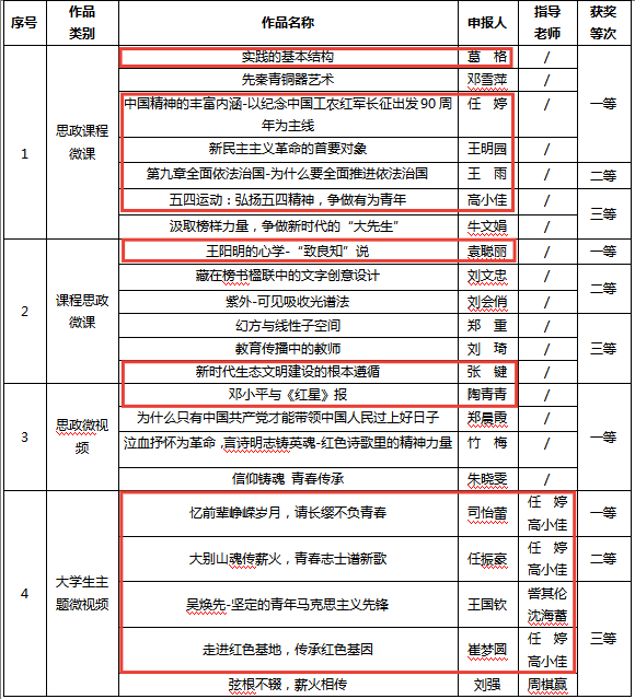近日,根据《关于开展2024年度河南省大思政微课(微视频)征集活动的通知》要求,河南省社科联、共青团河南省委、河南省高等教育学会、河南省高等学校思想政治理论课教学指导委员会组织专家评委会,对2024年度河南省大思政微课(微视频)征集活动申报作品进行了评选,太阳集团tyc599712件参赛作品均获奖(框红内)。其中,思政课程微课类作品一等奖3人、二等奖1人、三等奖1人;课程思政微课类作品一等奖1人、三等奖1人;思政微视频类作品一等奖1人;大学生主题微视频类作品一等奖1人、二等奖1人、三等奖2人。