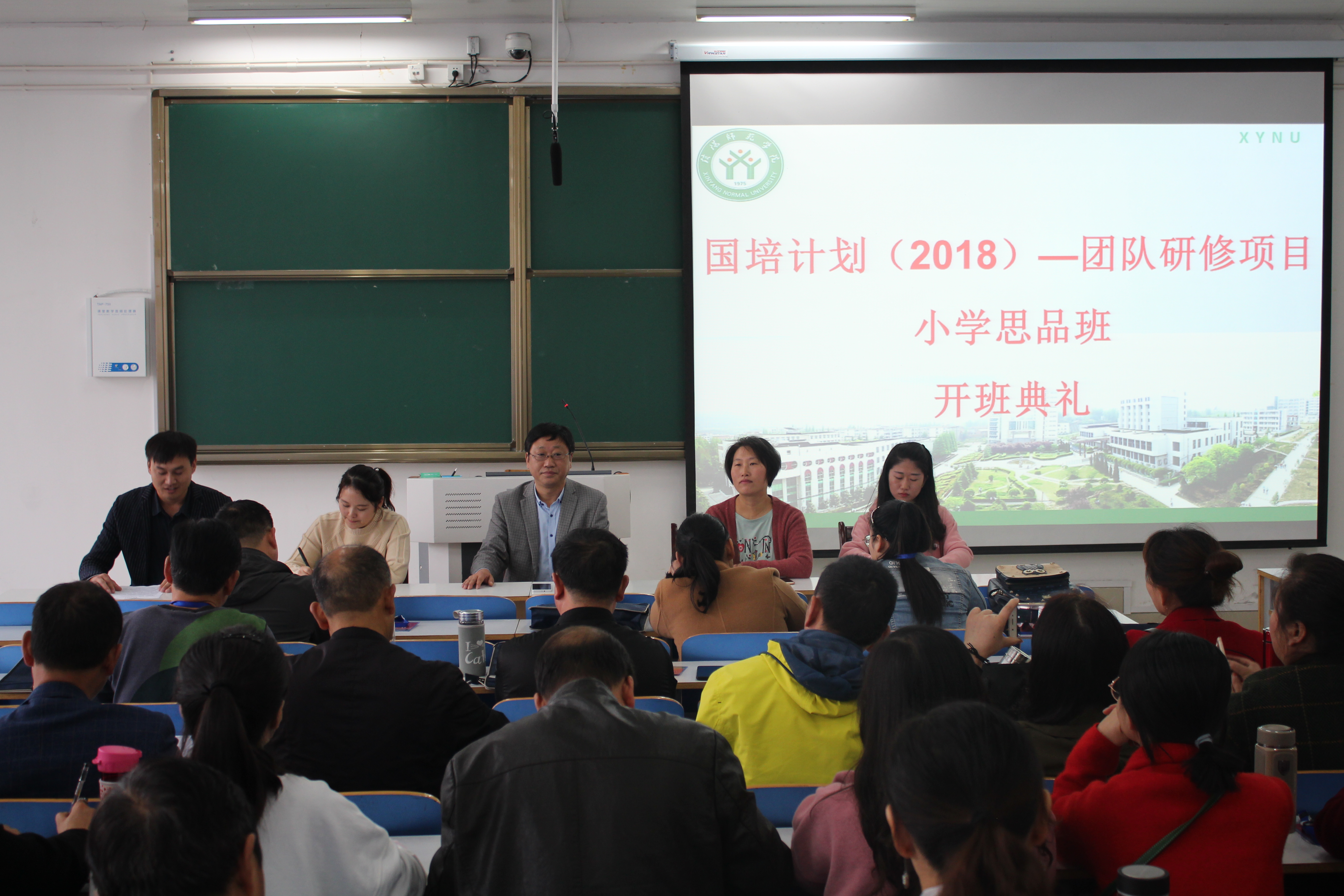 2018年10月19日上午,太阳集团tyc5997在社科楼516教室召开国培计划(2018)—团队研修项目小学思品班的开班典礼。副院长程晋富,国培班班主任訾其伦、董婧及国培计划河南省乡村教师培训团队的全体教师共同参加了此次典礼。