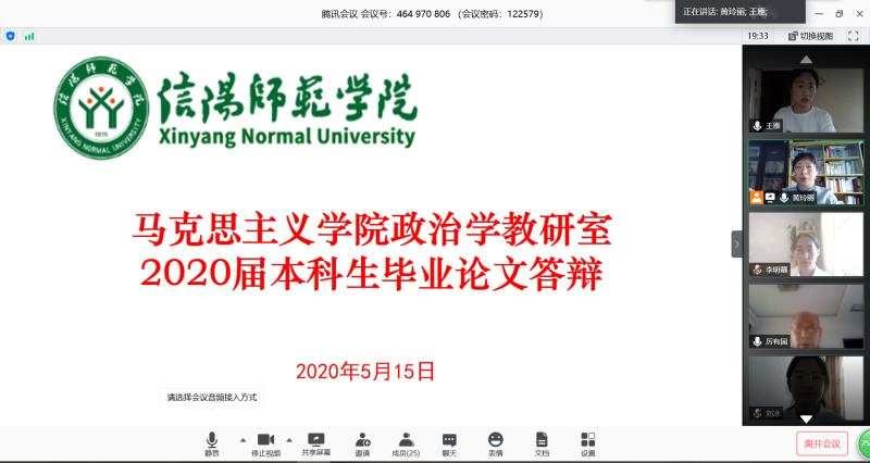 毕业论文答辩是本科阶段最后一个学习环节,是检验学生专业能力和综合素质的有效途径。本次线上答辩是在疫情的特殊环境下进行的,展现了疫情面前马院师生严谨的学术态度和良好的精神面貌,为学生的毕业就业创业打下了坚实的基础。