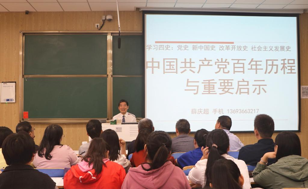 薛庆超援引习近平总书记关于“学习党史、国史,是坚持和发展中国特色社会主义,把党和国家各项事业继续推向前进的必修课”的重要论述,以中国共产党艰苦卓绝的奋斗历程为主线,从八个方面全景式地展现了中国共产党从大革命时期、土地革命时期、抗日战争时期、解放战争时期、社会主义革命和建设时期、改革开放时期到决胜全面建成小康社会时期波澜壮阔的历史图景。他详细阐述了中国共产党领导人民从苦难走向辉煌的百年奋斗历程,指出中国共产党取得胜利的关键在于善于总结经验,汲取教训。整场报告内容丰富、脉络清晰、旁征博引、深刻透彻,具有较强的指导借鉴意义。会后,薛庆超在社科楼323会议室,就大别山精神内涵,红旗渠精神的传承与发展等问题与我院师生进行了深入的互动交流。