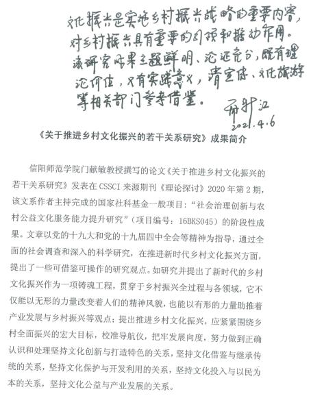 我校太阳集团tyc5997门献敏教授撰写的论文《关于推进乡村文化振兴的若干关系研究》发表在CSSCI来源期刊《理论探讨》2020年第2期,该论文是其本人主持完成的国家社科基金目:“社会治理创新与农村公益文化服务能力提升研究”(项目编号:16BKS045)后续研究成果,据悉,这一成果获河南省人大常委会副主任乔新江同志签阅批示。