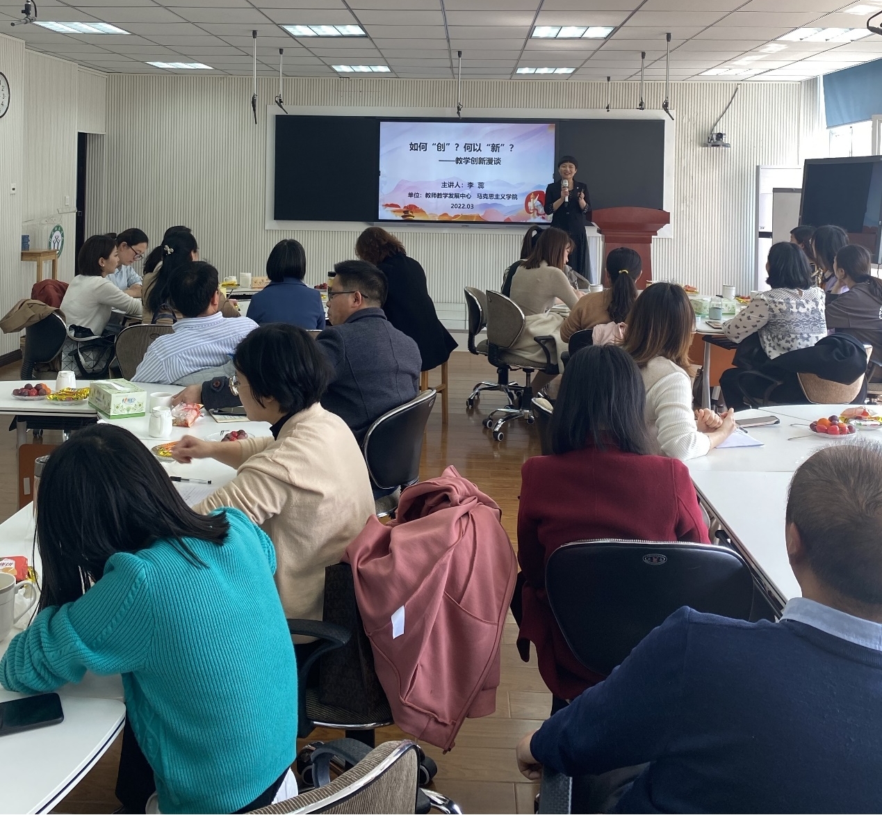 3月11日,我院副院长李蕊教授应教师教学发展中心邀请,在教7楼501教室作 “如何 ‘创’? 何以 ‘新’ ? ——教学创新漫谈”专题讲座,我院近20名青年教师和其他学院10多位教师参加了本次活动。