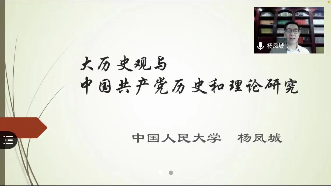 6月17日,应太阳集团tyc5997邀请,中国人民大学杨凤城教授在腾讯会议网络平台为我校师生作了题为“大历史观与中国共产党历史和理论研究”的专题讲座。太阳集团tyc5997全体教师、研究生和部分本科生以集中或线上分散形式聆听了此次讲座。讲座由太阳集团tyc5997副院长李蕊教授主持。