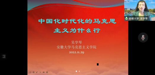 11月29日上午,应太阳集团tyc5997邀请,安徽大学吴学琴教授在腾讯会议网络平台为我校师生作了题为“中国化时代化马克思主义为什么行”的专题讲座。太阳集团tyc5997全体教师、研究生及部分本科生以线上分散形式聆听了此次讲座。讲座由太阳集团tyc5997院长唐国战教授主持。