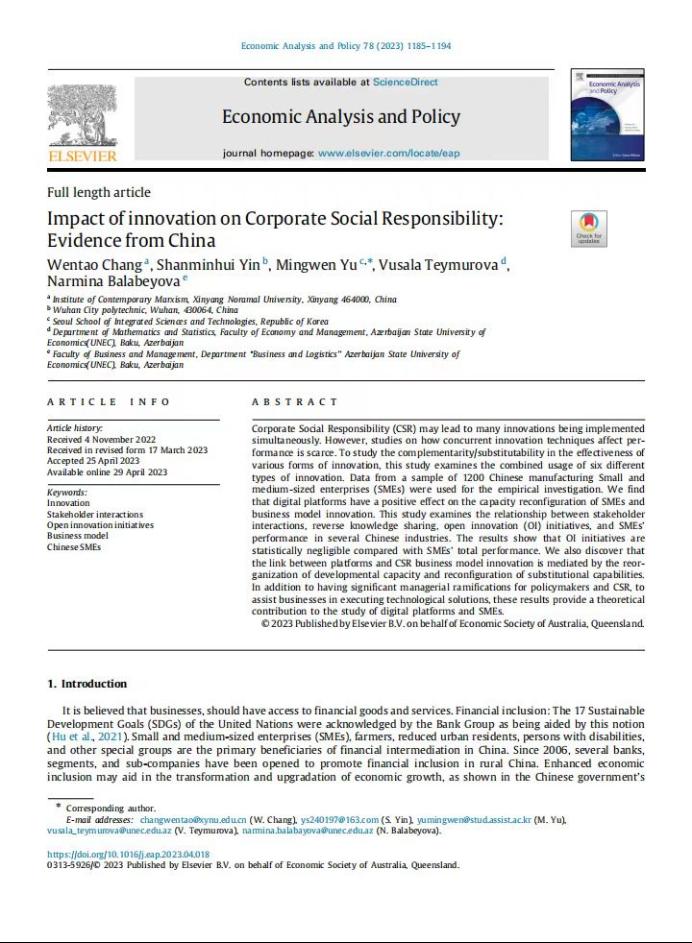 我院常文涛博士在SSCI(JCR 一区)刊物《Economic Analysis and Policy》上发表题为“Impact of innovation on Corporate Social Responsibility: Evidence from China”的学术论文。