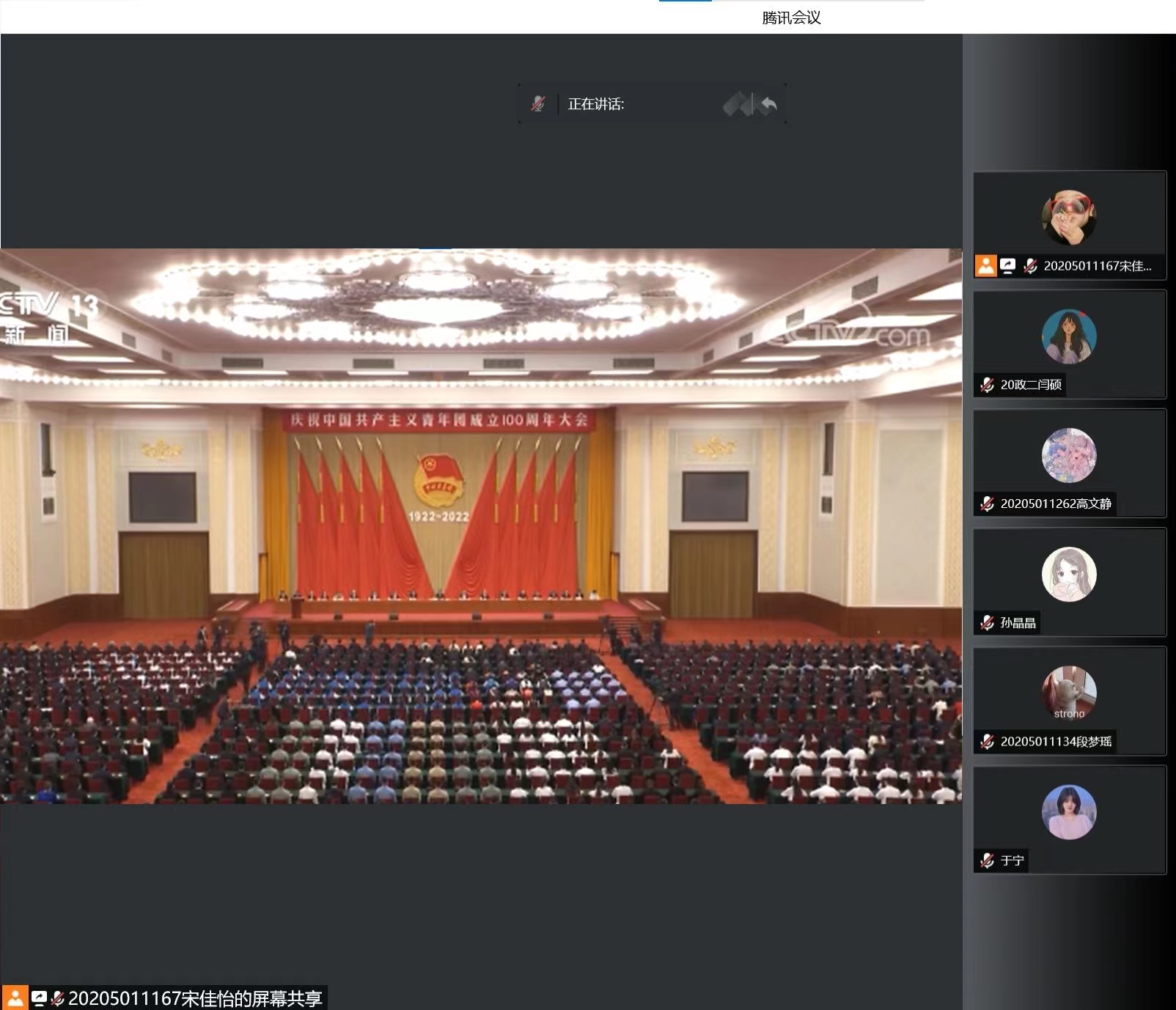 5月14日晚,太阳集团tyc5997第三期优秀“青马”工程学员们通过腾讯会议共同观看习近平总书记在庆祝中国共青团成立100周年大会上的讲话。活动由班长宋佳怡主持。