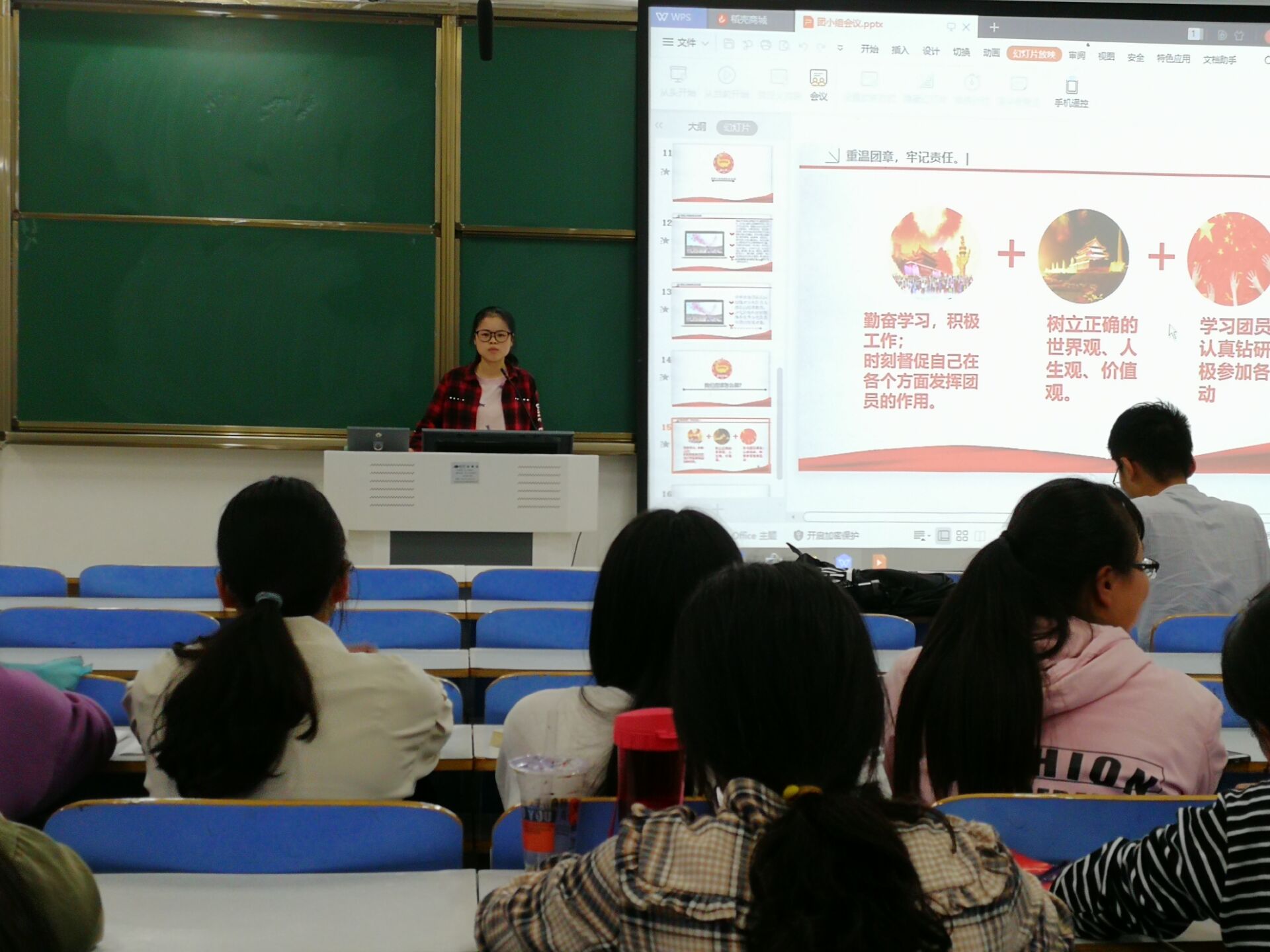 首先,孙亚茜介绍了《中国共产主义青年团章程》共包含总则和十章的内容,并对第八章《团旗、团徽、团歌》及第十章《团同少年先锋队的关系》进行详细的阐述。通过让大家观看了《厉害了,我的国》片段,使同学们更好地认识祖国一步步迈向伟大复兴的进程。随后,她向同学们讲述了先进爱国事例,以此促进大家的爱国情怀,清楚自己的使命和担当。最后,孙亚茜对以后的学习提出了几点提议与同学们共勉。