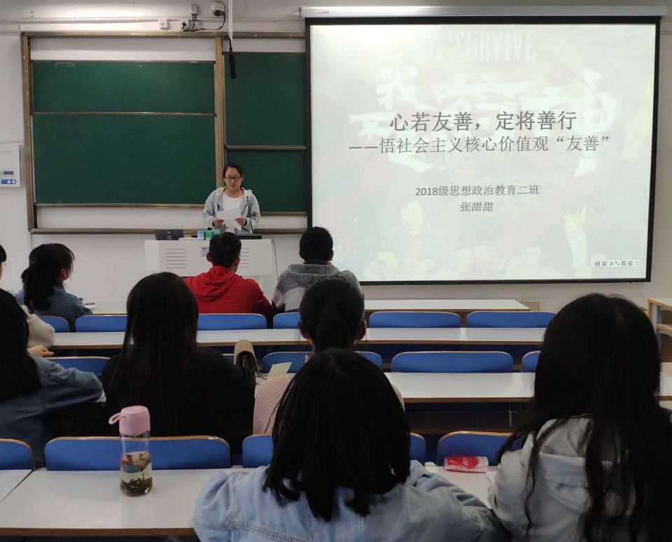 4月10日下午,我院优秀“青马”工程学员张甜甜参加了2018级第二团支部于社科楼516教室开展的讲价值观故事活,并籍此进行宣讲。我院实践部、新闻部、心理健康部相关负责人和2018级各班班委共同参与本次活动。