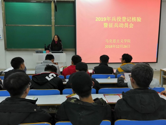 国无防不立,民无兵不安。为响应我国大学生征兵工作的号召, 12月26日下午,我院于社科楼516召开2019年兵役登记核验暨征兵动员会。我院2018级全体男生参加了本次动员会。本次动员会由武装干部曹菁菁主持。