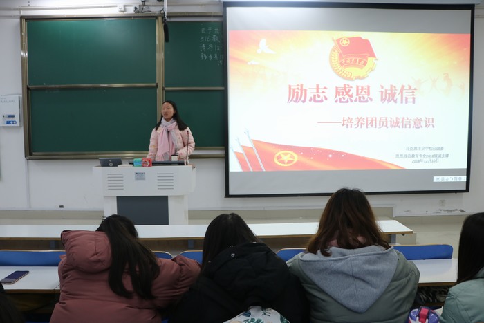 为培养我院团员诚信意识,养成高尚的道德情操,12月10日下午,我院“励志·感恩·诚信”主题团课在社科楼516教室顺利召开。我院2018级全体团员共同参加了此次团课。此次团课由2018级第一团支部团支书靳雨露主持。