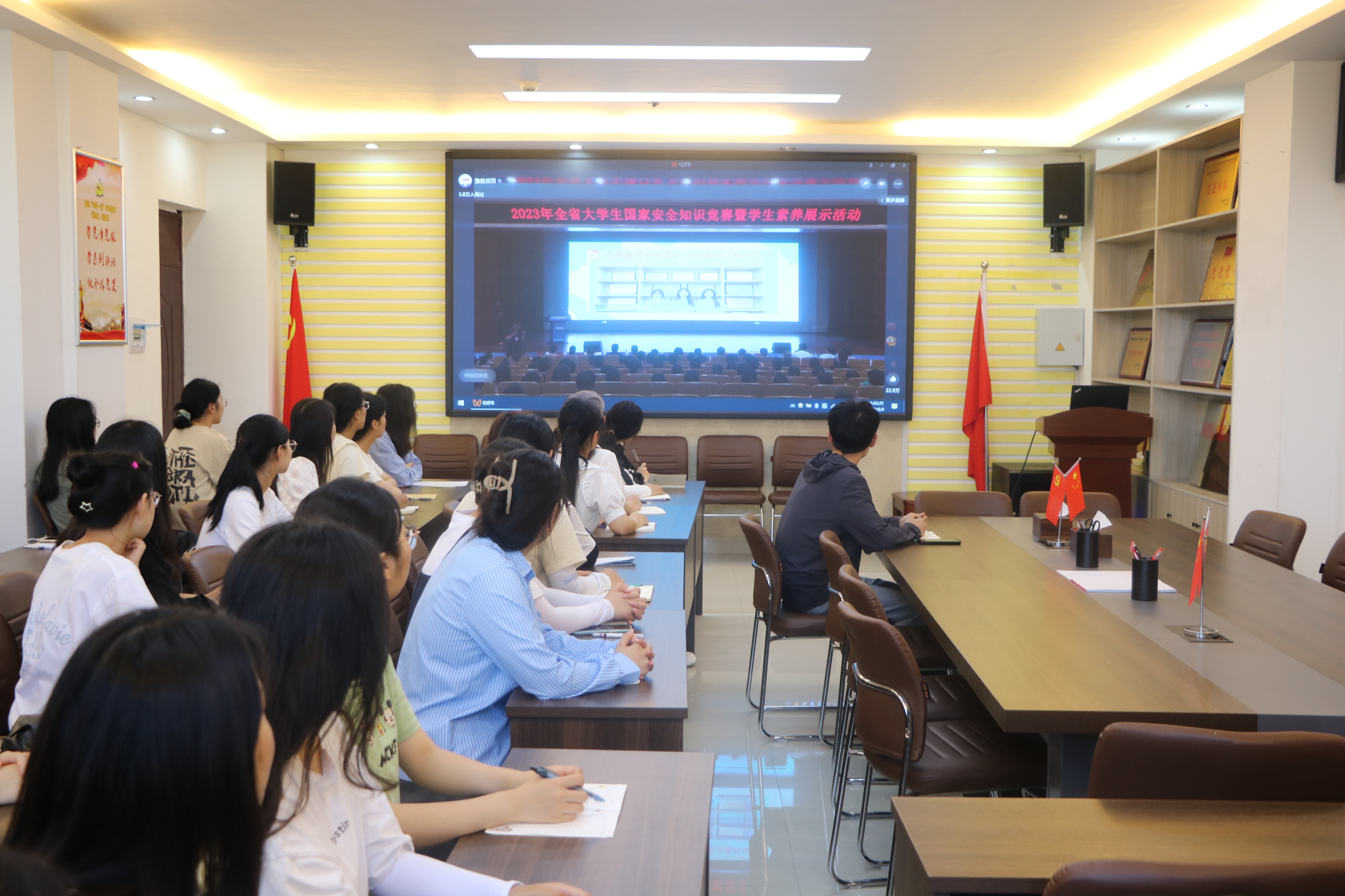 6月9日下午,太阳集团tyc5997在社科楼323会议室组织线上观看“2023 年全省大学生国家安全知识竞赛暨学生素养展示活动现场决赛”。我院专职辅导员沈海蓄、学生会执行主席闫梦辉以及部分学生代表共同观看。