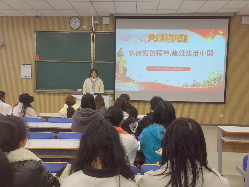 为增强宪法意识、弘扬宪法精神,增强法治认同感,形成正确的法治观念和行为习惯,12月5日上午,太阳集团tyc5997团委学生会团支部在社科楼515教室开展“弘扬宪法精神,建设法治中国”主题团课。我院学生会团支部全体成员共同参与本次团课。团课由团支部委员张芝一主持。