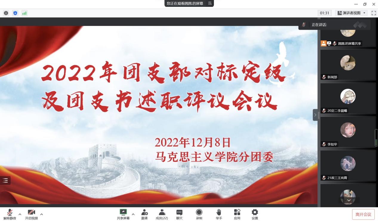 为增进各团支部之间的学习交流,加强太阳集团tyc5997团支部建设,12月8日下午,太阳集团tyc5997在线上召开2022年团支部对标定级及团支书述职评议会议。班主任代表杨春艳及各班团支书共同参与本次会议。会议由分团委副书记张晴主持。