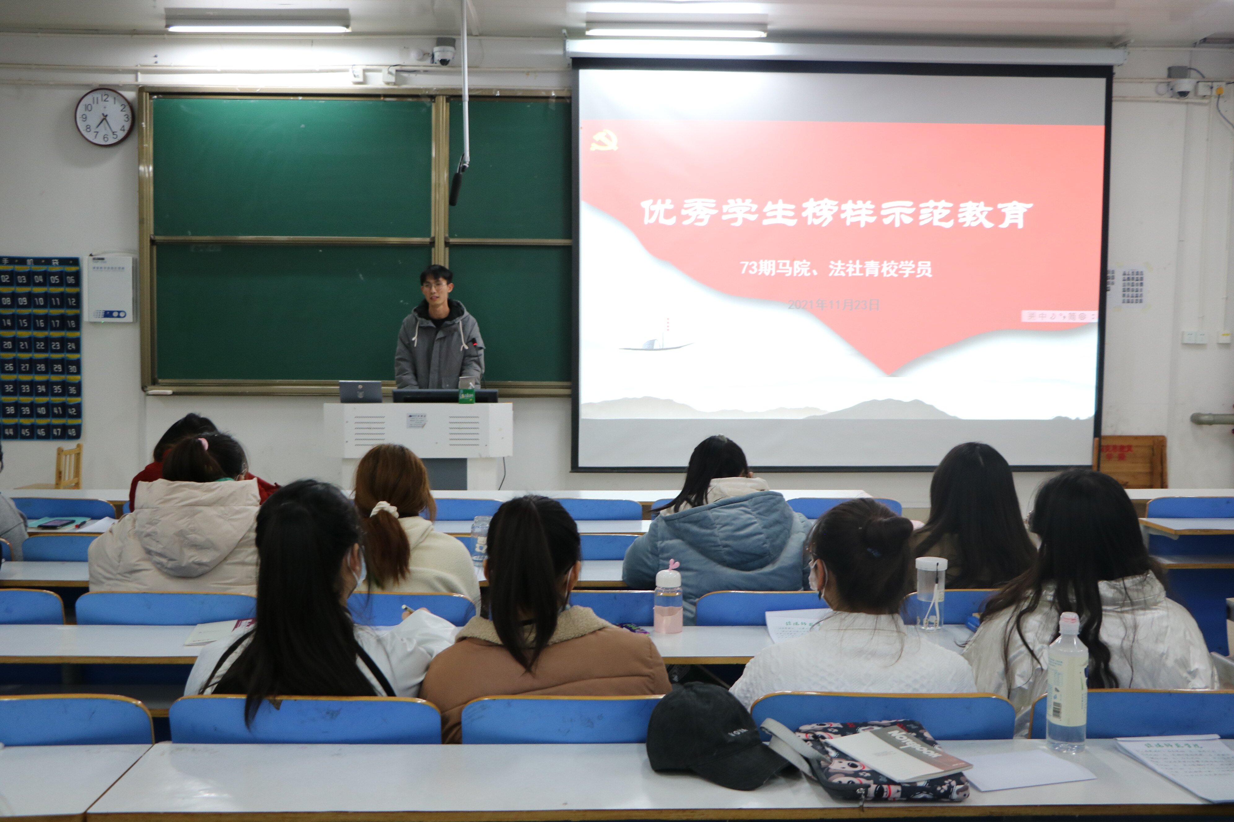 11月23日晚,太阳集团tyc5997和法学与社会学学院第73期青校学员在社科楼516教室开展优秀学生榜样师范教育活动。活动由法学与社会学学院组长张璨主持。