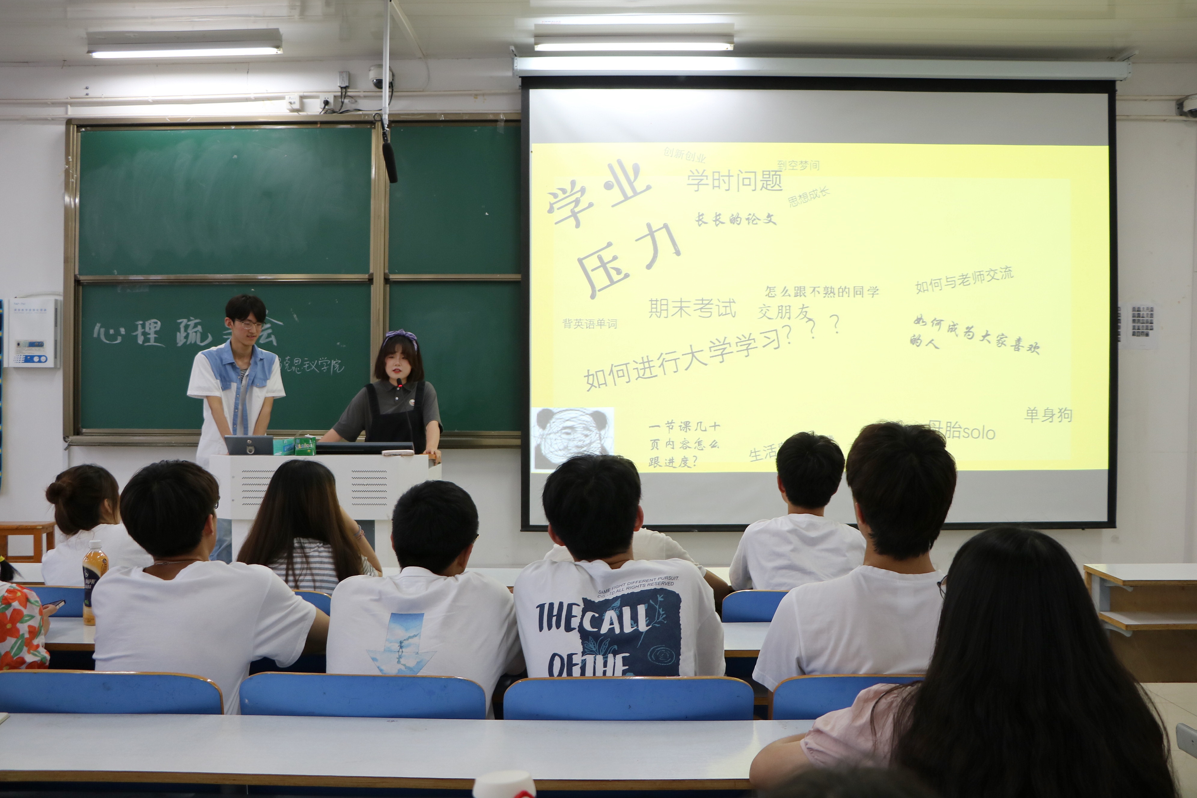 本次疏导会分为“我们生活中常见的心理问题”、“心理小测试和游戏环节”、“敞开心扉,分享烦恼”、“如何积极面对心理问题”四个部分进行。首先,林兆申列举了如何处理寝室关系、如何合理支配生活费等生活中同学们常遇到的烦恼。接着,他让同学们进行了两个心理小测试,通过测试,让他们进一步了解自己的社交能力与性格特点。在“海内存知己”游戏环节,同学们随机分组,依次介绍自己,拉近了同学之间的距离,活跃了现场氛围。最后,王玮琳对同学们在学习生活中的烦恼进行分析,并提出意见。她提出,同学们要确立新的适合自己的追求目标,正确对待学习、生活与就业带来的压力,对待情感问题要理智,不要迷失自己,面对压力要积极转移注意力,学会自我宣泄。