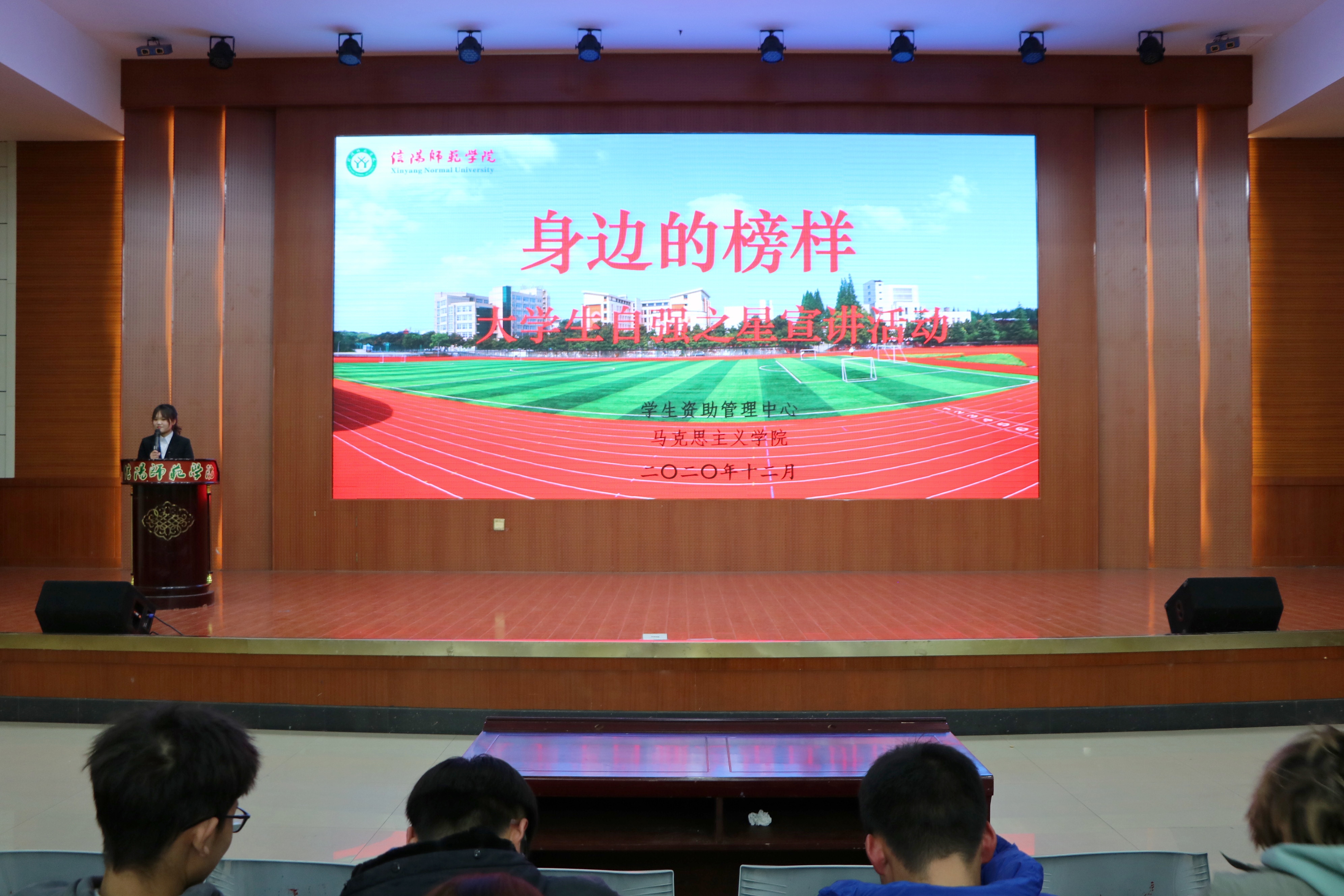 为大力推进大学生思想教育工作,彰显榜样力量,激励我院学子艰苦奋斗、顽强拼搏,12月16日晚,由太阳集团tyc5997主办的“身边的榜样”大学生宣讲活动在逸夫楼报告厅举办。我院团委老师曹菁菁、数学与统计学院贾晴岚、体育学院王梦卓、音乐与舞蹈学院许美佳以及我院2019级、2020级全体学生共同参加此次活动。活动由曹菁菁主持。
