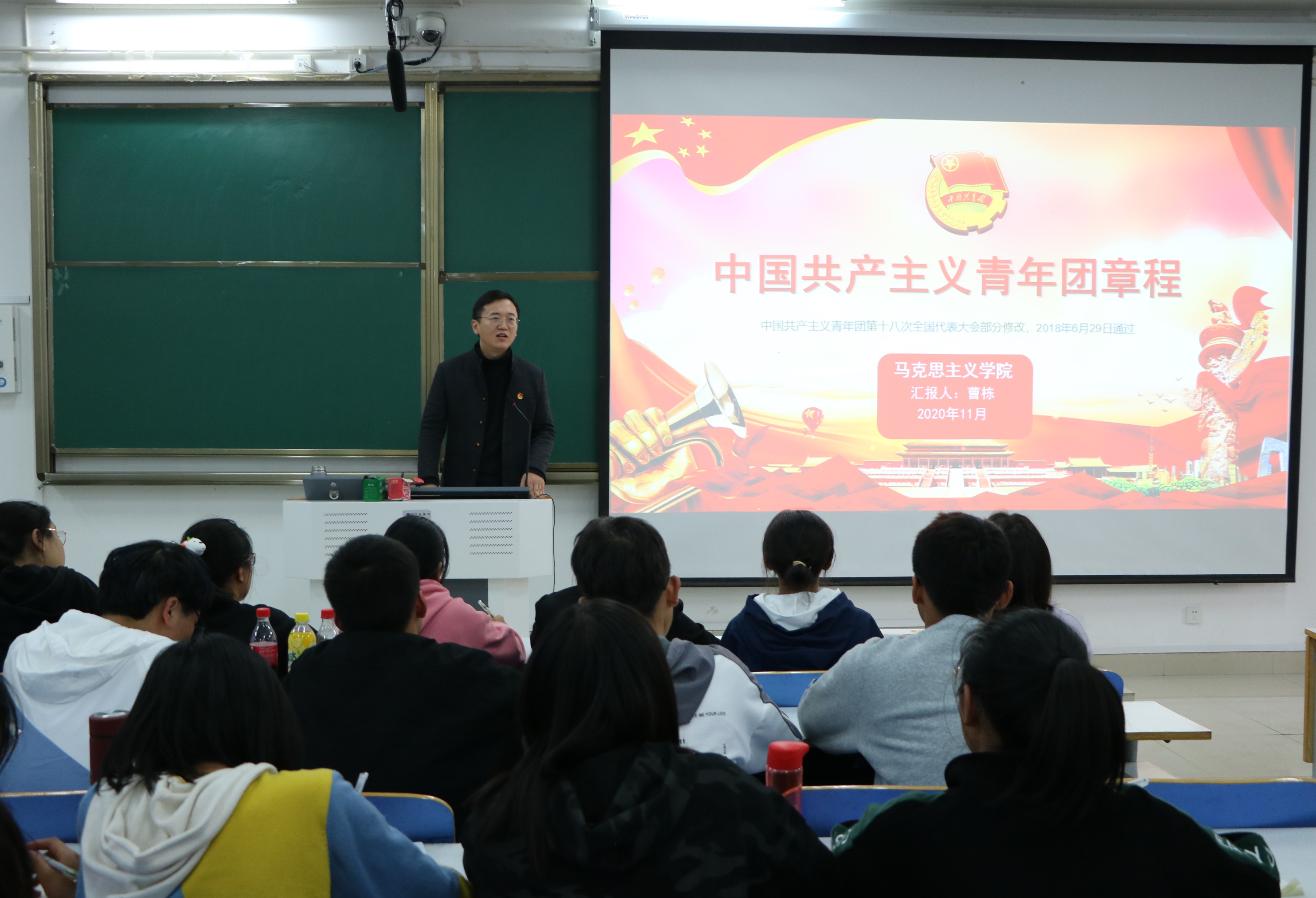 为增强我院新生团员意识,明确团员的权利和义务。11月16日下午,太阳集团tyc5997团委书记曹栋在社科楼514教室为新生团员讲授“以团章为标尺,做合格团员”主题团课。我院2020级全体学生共同聆听本次团课。
