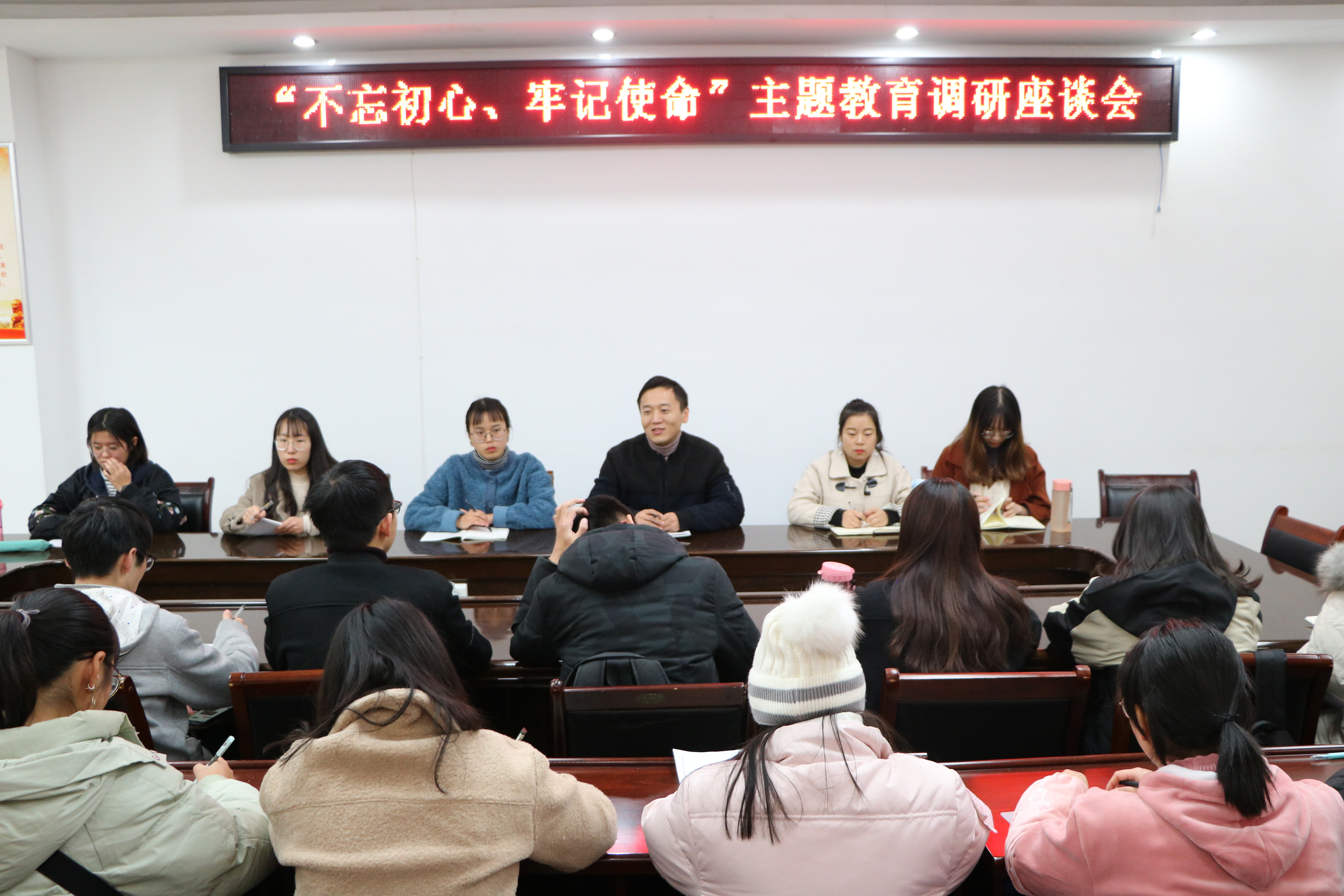 为进一步贯彻落实“不忘初心,牢记使命”主题教育活动,提升学生干部队伍服务能力,11月28日晚,太阳集团tyc5997在社科楼323会议室顺利召开了“不忘初心,牢记使命”主题教育调研座谈会,我院团委书记曹栋,各班班委和学生代表,学生会主席团,各部门及社团负责人共同参加了本次座谈会。会议由曹栋主持。