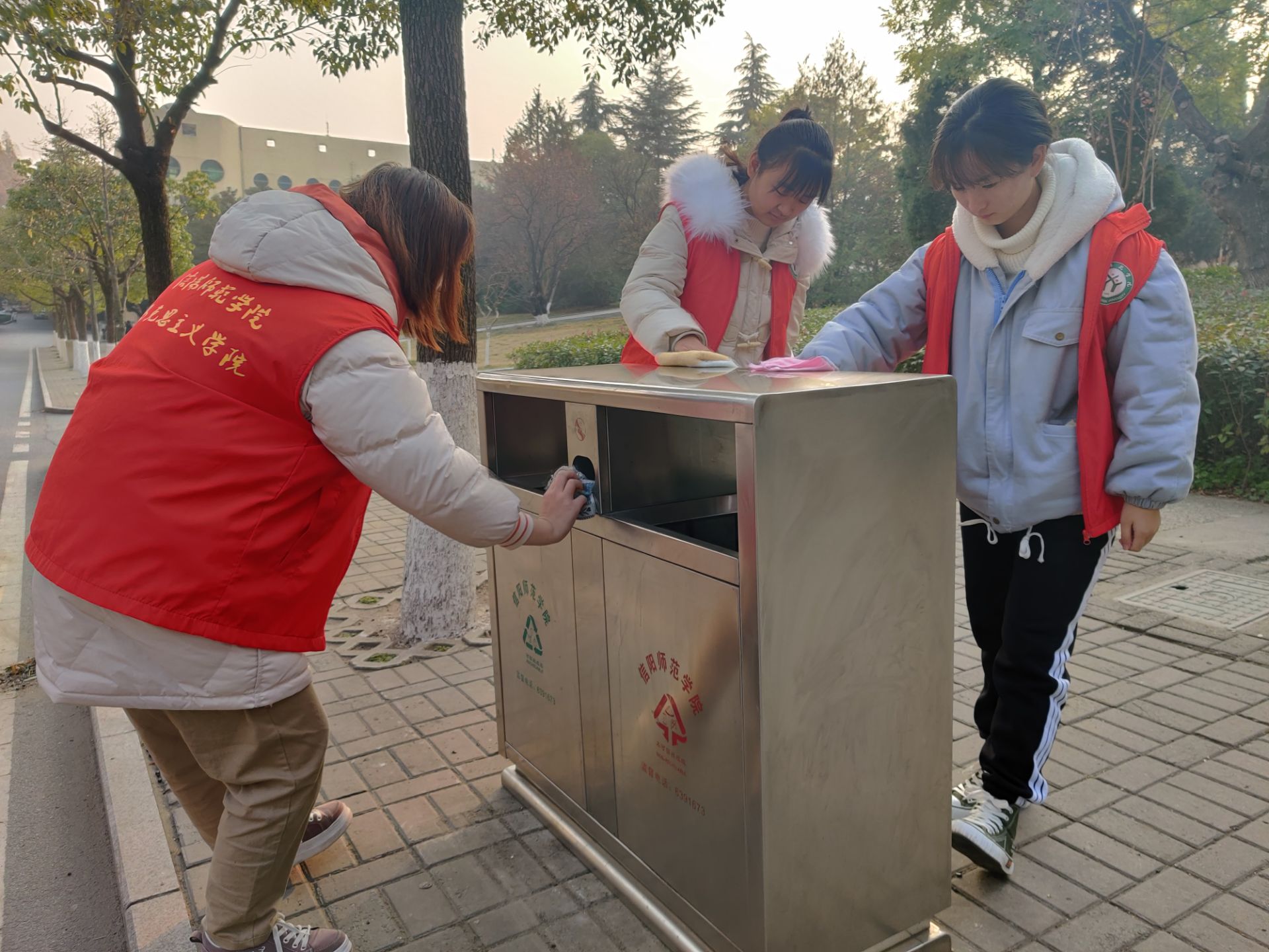 下午,我院思想政治教育一班团支部书记贾子漪带领同学们在校园内进行垃圾桶清洁志愿服务活动。活动中,同学们擦除筒壁上的污渍,捡拾散落的垃圾并进行分类后放入桶内。明确的分工和默契的配合将校园垃圾桶清理得焕然一新。最后,同学们在一棵树广场发表了自己参与志愿服务后的心得体会,大家纷纷表示,日后的学习生活中要积极踊跃参加志愿活动,提高自身服务社会意识,争做优秀的青年团员。