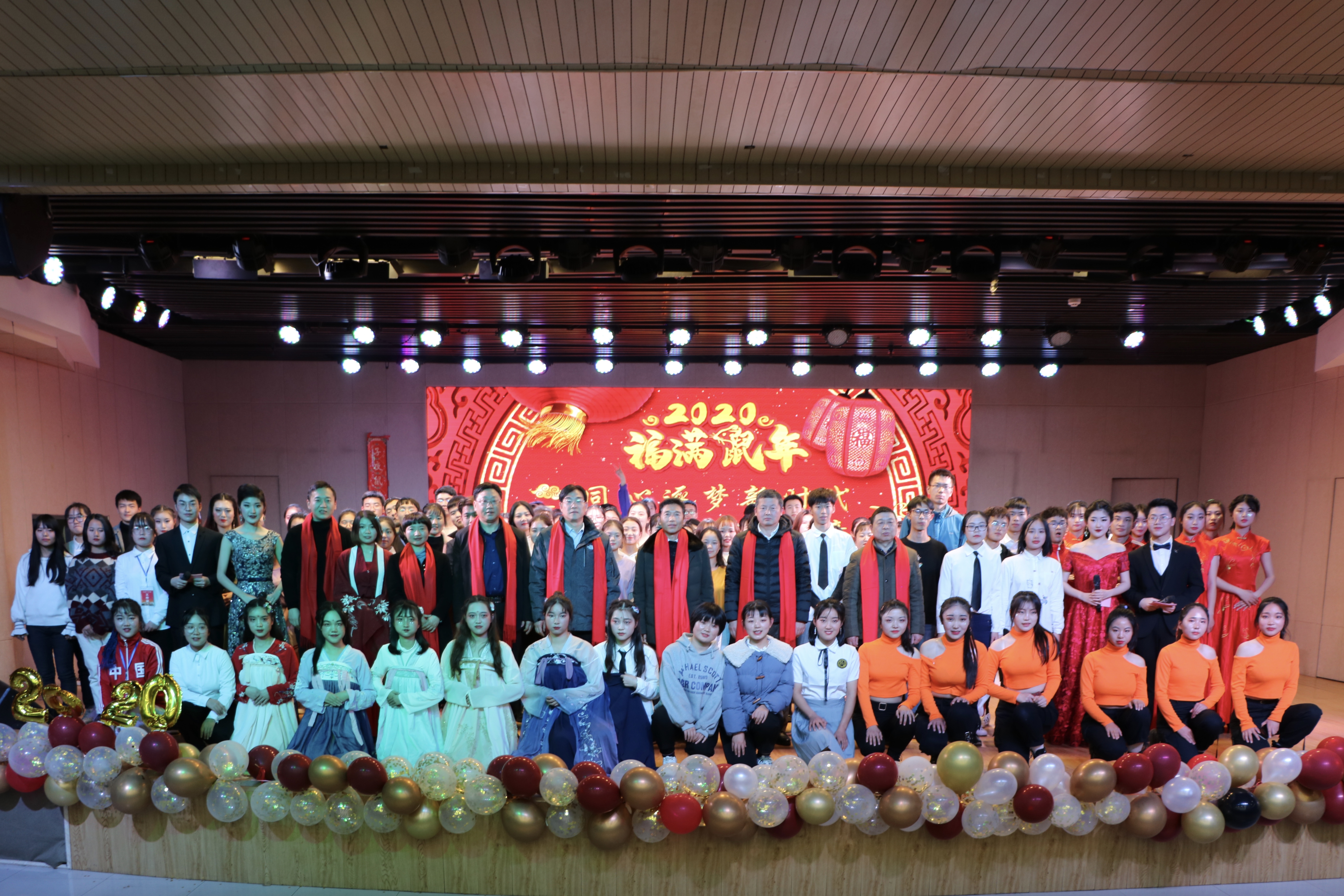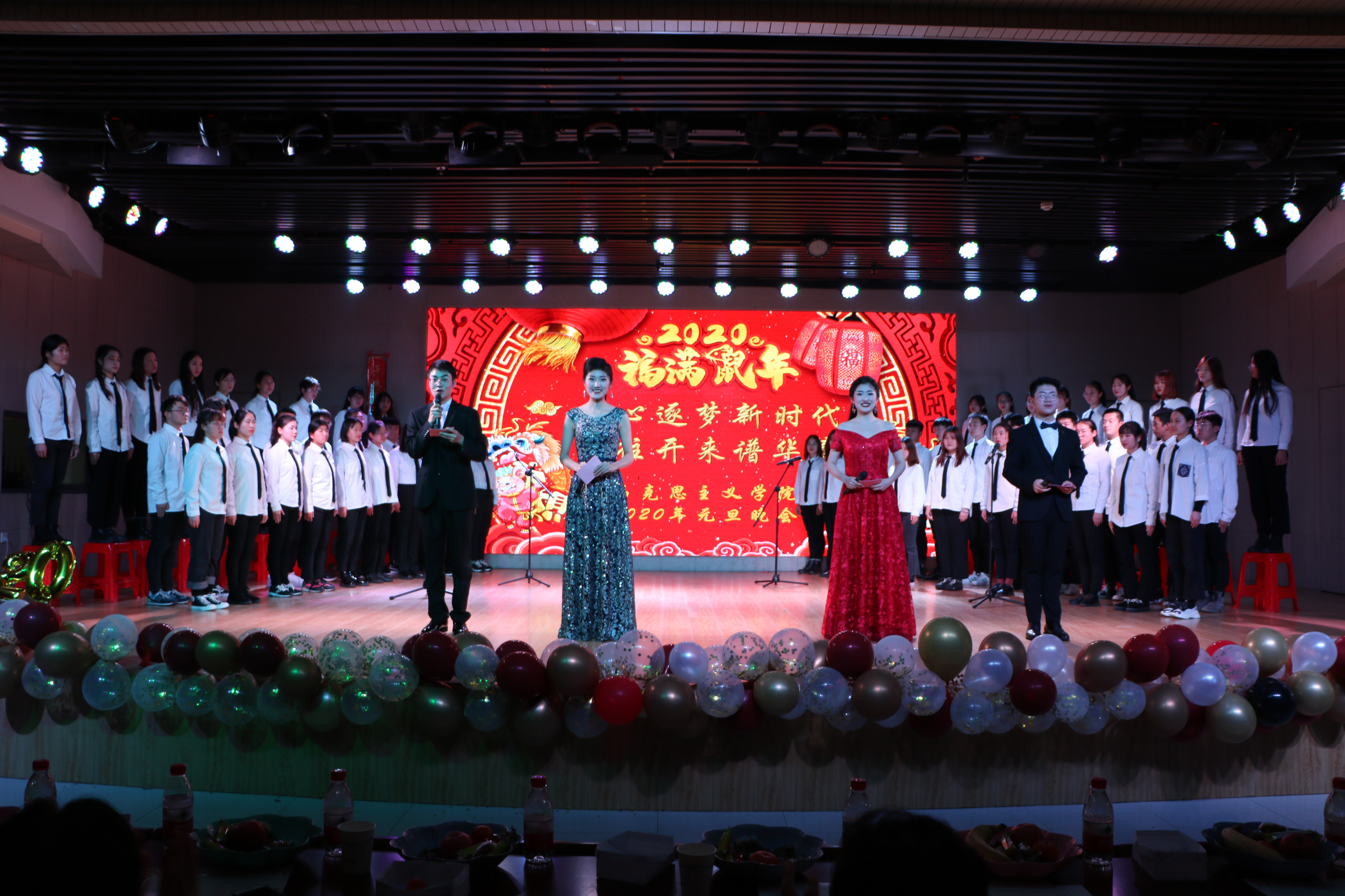 晚会开始前,学院师生和家长分别以VCR视频的形式总结回顾了2019年的工作,向全院师生致以最诚挚的新年祝福。整场晚会紧扣奋进新时代的主题,现代流行与古典意蕴激烈碰撞,温暖柔情与激情动感并举。其中小品、歌曲、音乐剧、舞蹈等多种表演形式轮番上阵、异彩纷呈。伴随着绚丽的灯光,晚会在青春洋溢、魅力四射的开场舞中拉开帷幕。古风歌曲《半壶纱》巧妙融合古典韵律与汉服文化,悠扬动听的歌曲与唯美曼妙的舞蹈相得益彰,让观众陶醉于诗情画意之中。相声《我的style》以幽默诙谐的语言展现出中原之音——河南话的无限魅力。小品《一切都是最好的安排》语言诙谐、妙趣连连、以小见大,生动地向观众传达出美好的不期而遇之意,引人深思。舞蹈《大中国》节奏轻快明朗,动作刚柔并济,以动感十足的舞步展现出我院学子朝气蓬勃、昂扬向上的面貌,表达当代青年对实现中国梦的美好期盼以及身为社会主义接班人的自豪与骄傲。我院党政领导班子与学生代表共同朗诵《不忘初心》,满怀深情地颂扬七十年风雨兼程的建国历程和新时代砥砺奋进的中国精神,体现出中华儿女对伟大祖国的热爱与展望之情。整场晚会气氛热烈,高潮迭起,其中穿插的微信抽奖互动环节更加丰富了本场晚会的内容。最后,晚会在新时代大学生合唱团的合唱《传奇》中圆满落幕。